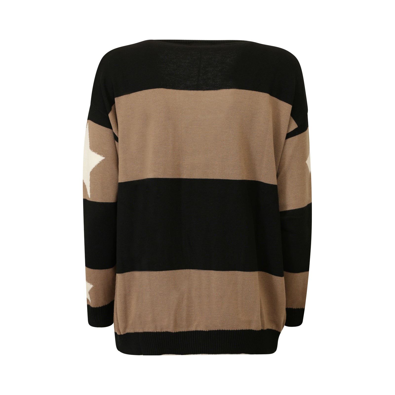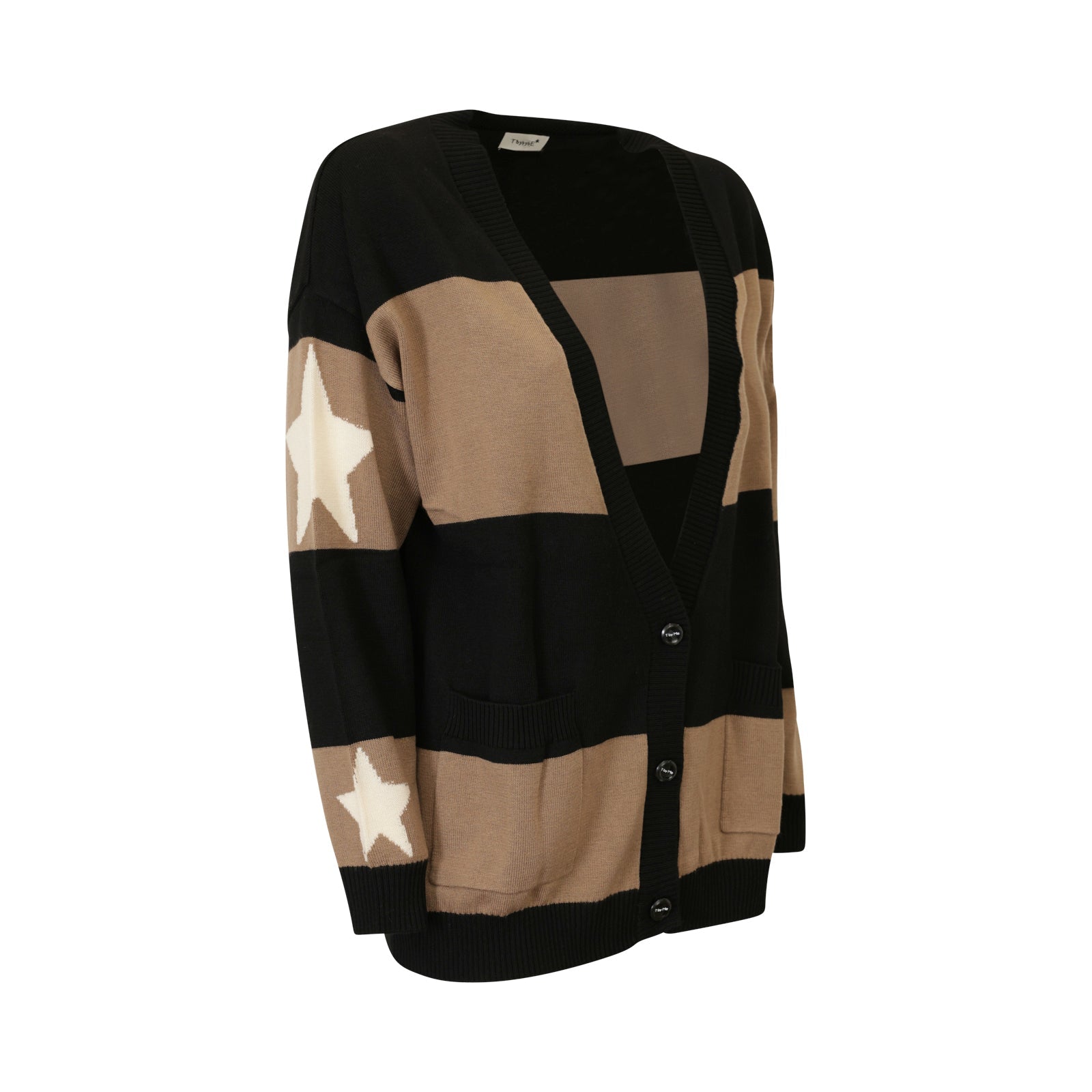 Cardigan nero e beige di T by ME in misto lana con chiusura con 3 bottoni, tasche applicate, stelle a contrasto in bianco e bordi a costine.