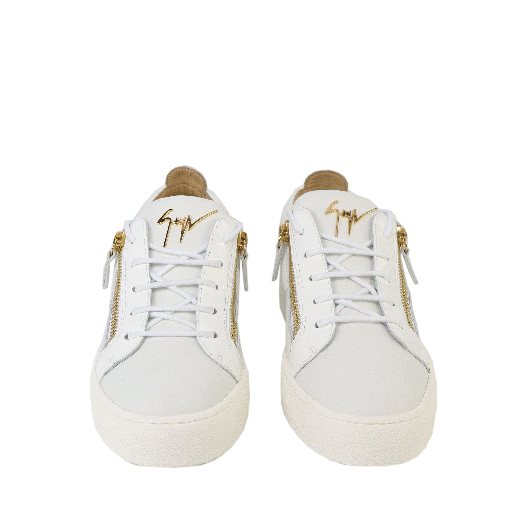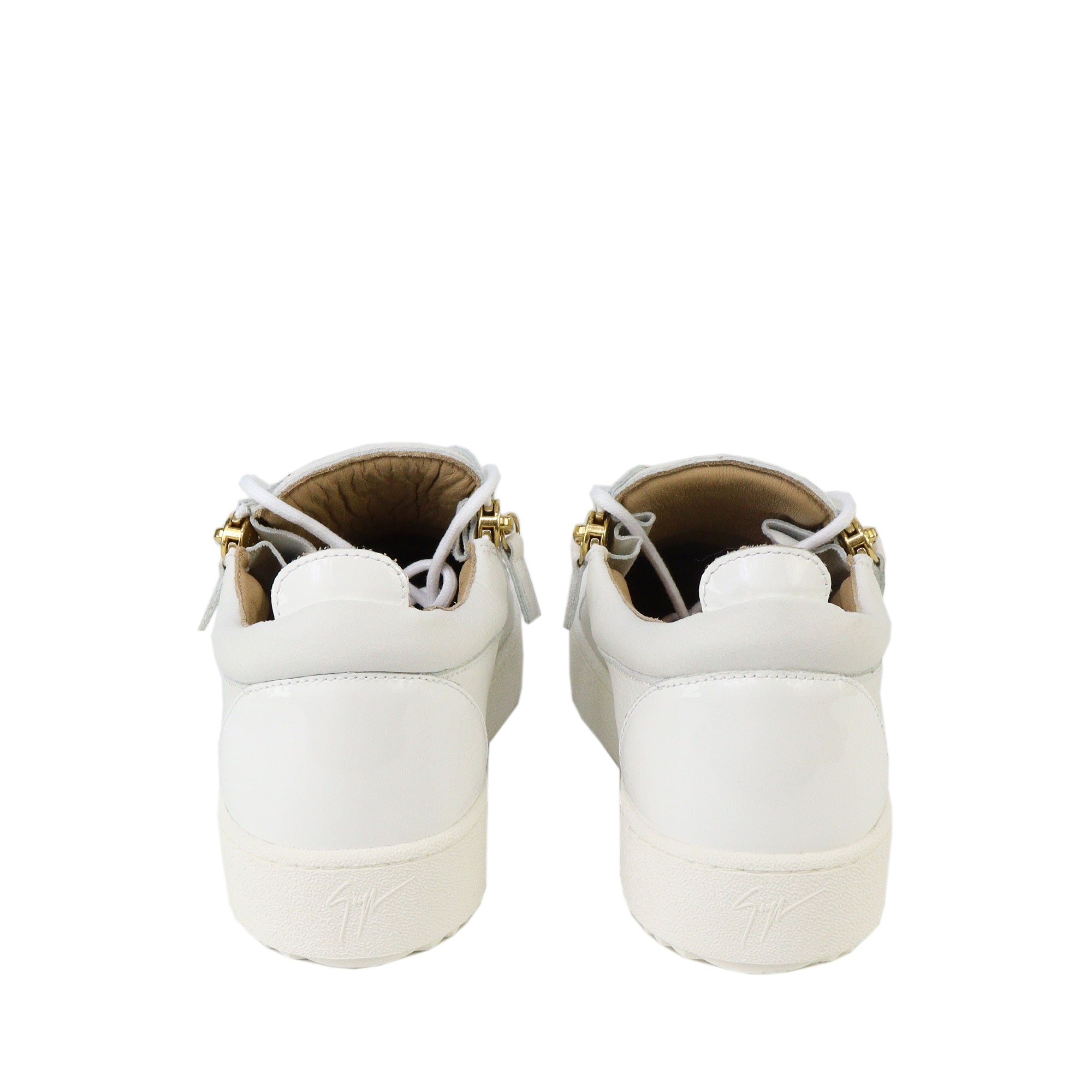 Sneakers FRANKIE bianca di GIUSEPPE ZANOTTI DESIGN realizzata in pelle con profili in vernice in tinta, zip e logo in oro. Fondo in gomma