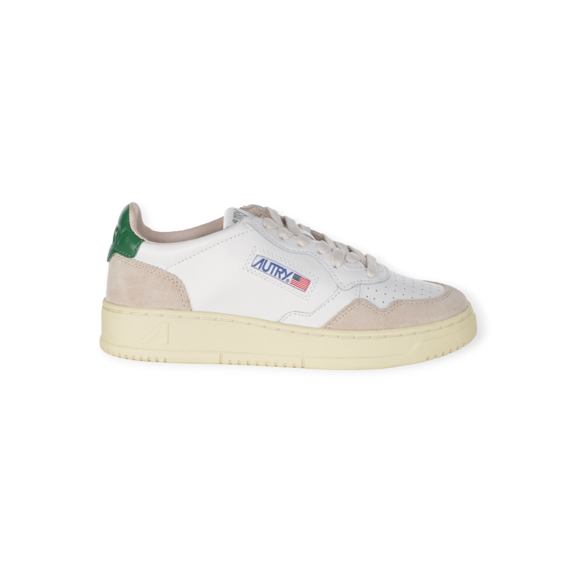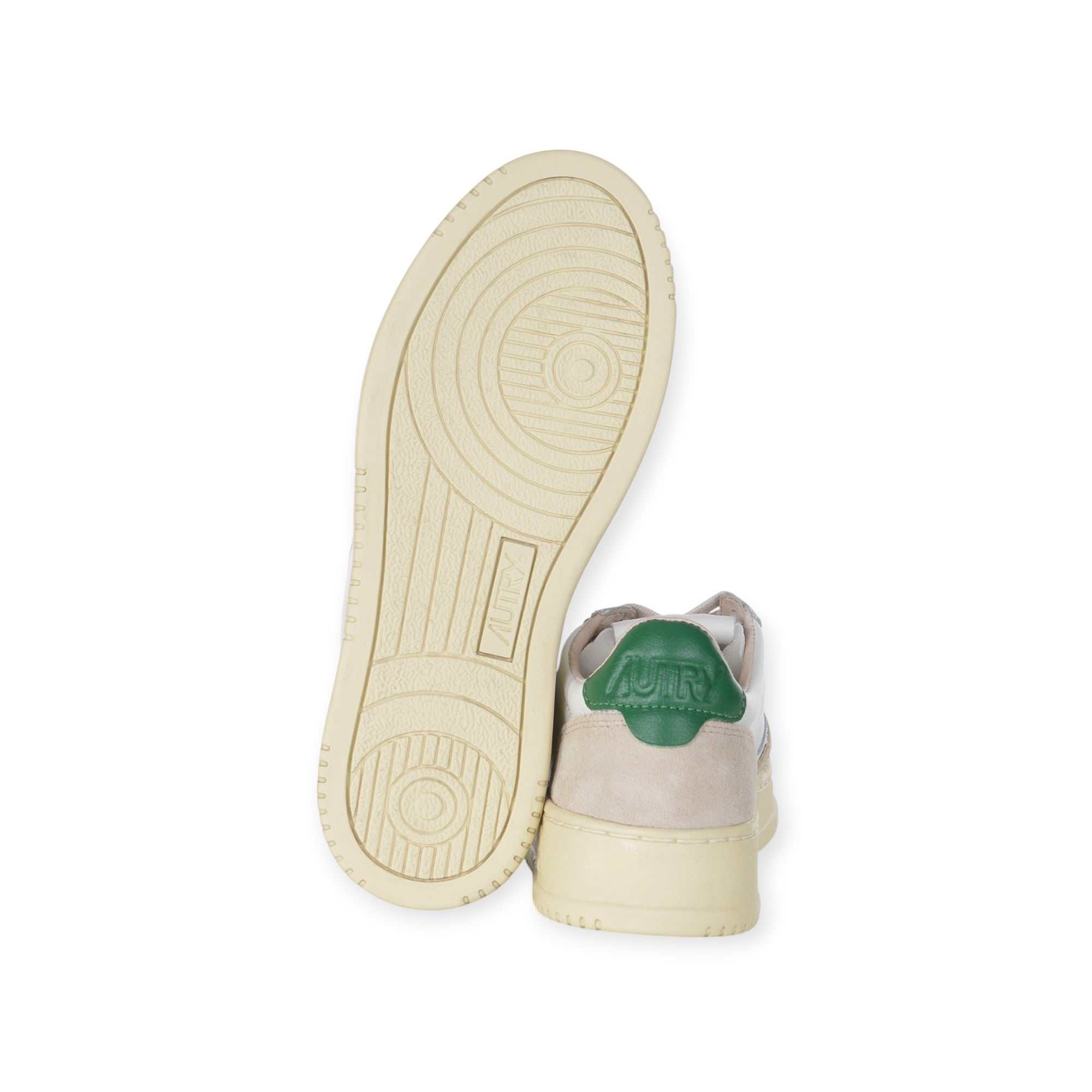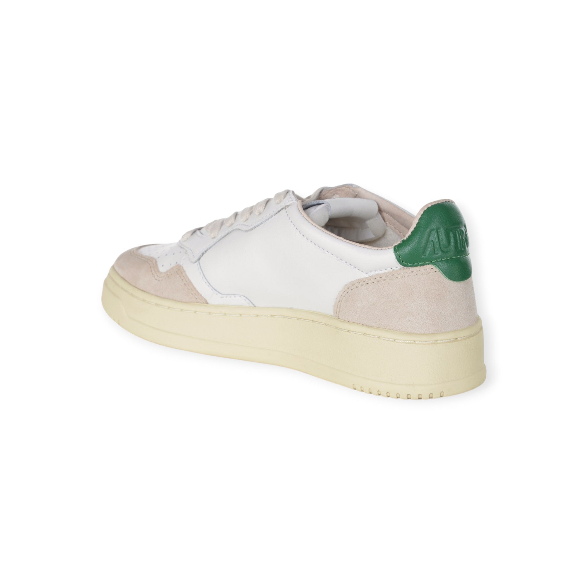 Sneakers MEDALIST bianca di AUTRY in pelle con profili in camoscio beige, talloncino in pelle verde, patch con logo laterale, punta traforata e fondo in gomma.