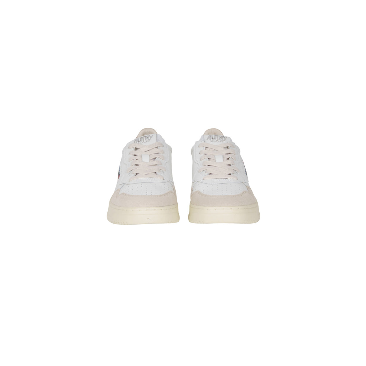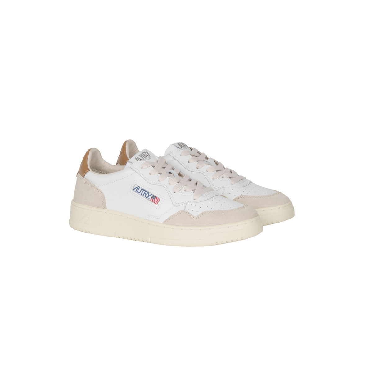 Sneakers MEDALIST LOW bianca di AUTRY in pelle con profili in camoscio beige, talloncino in pelle cuoio, patch con logo laterale, punta traforata e fondo in gomma.