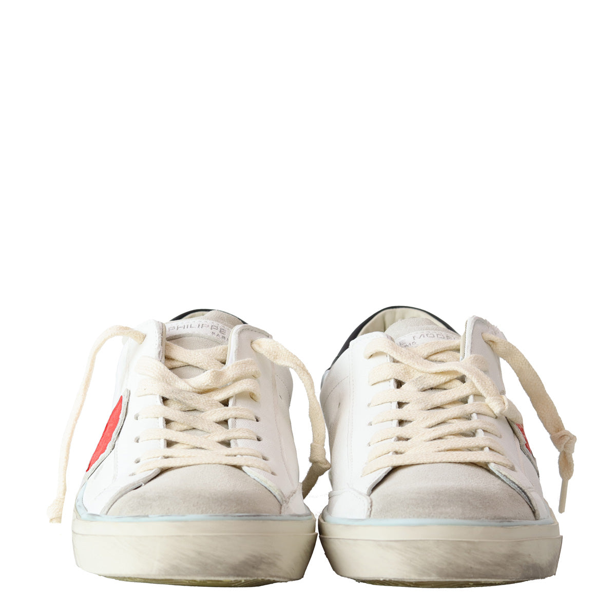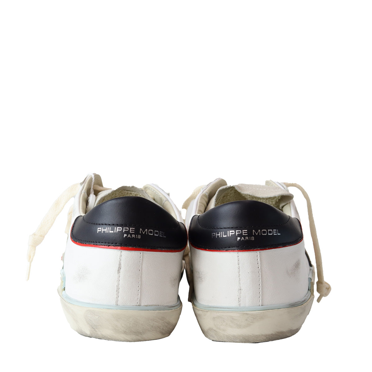 Sneakers PARIS bianca di PHILIPPE MODEL in pelle con puntale in camoscio ghiaccio, tallone in pelle nera con profilo in rosso, logo in pelle rossa con profilo in camoscio grigio, profilo del fondo in gomma celeste e fondo in gomma bianca con leggero effetto used.