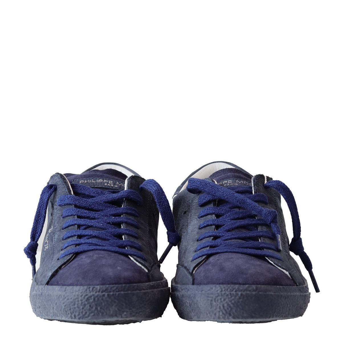 Sneakers PARIS blu di PHILIPPE MODEL in pelle nabuk con profilo del tallone in pelle bianca, logo lettering e fondo in gomma in tinta.
