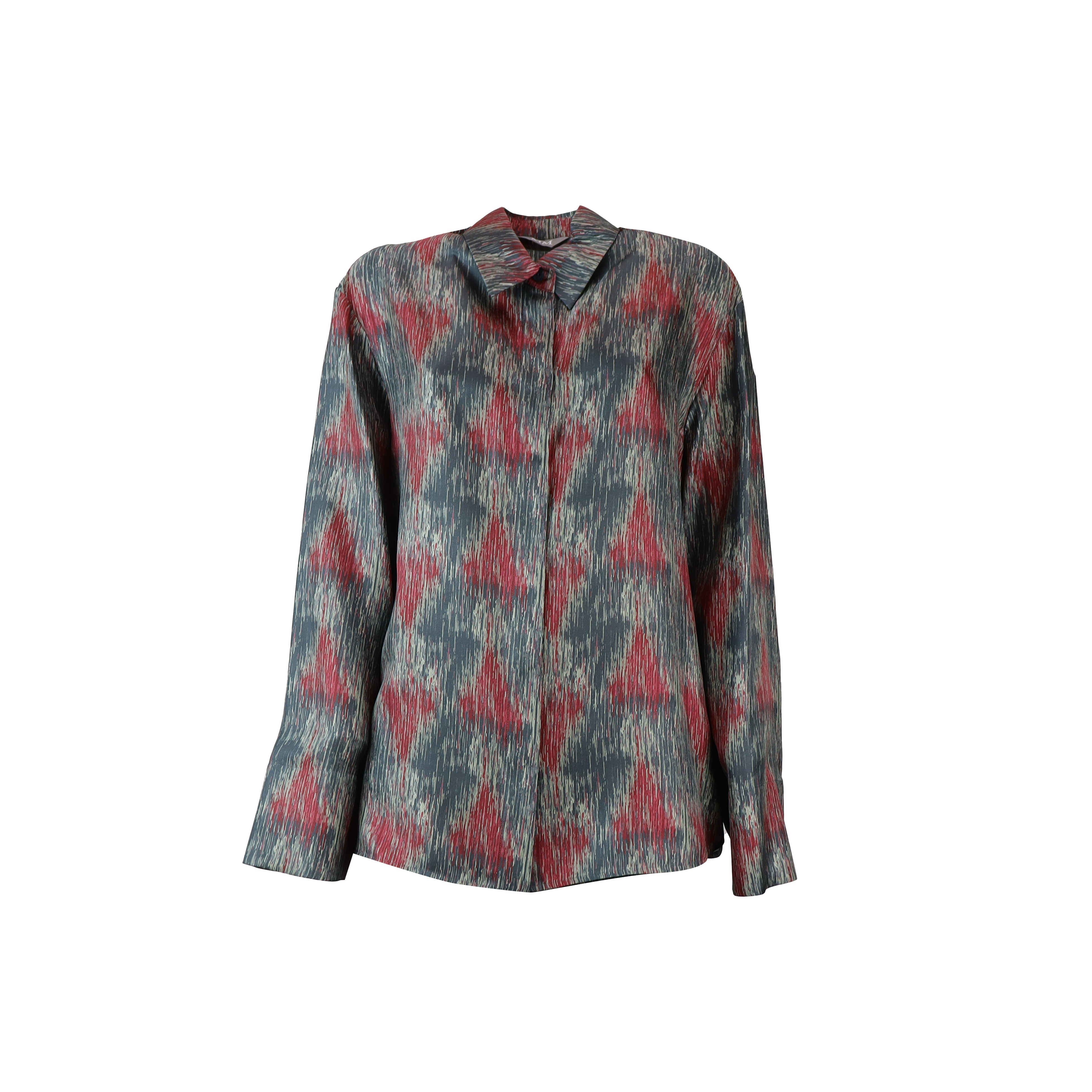 MM MAX MARA guest patterned silk shirt with classic collar, concealed button fastening, long sleeves, green and red pattern.