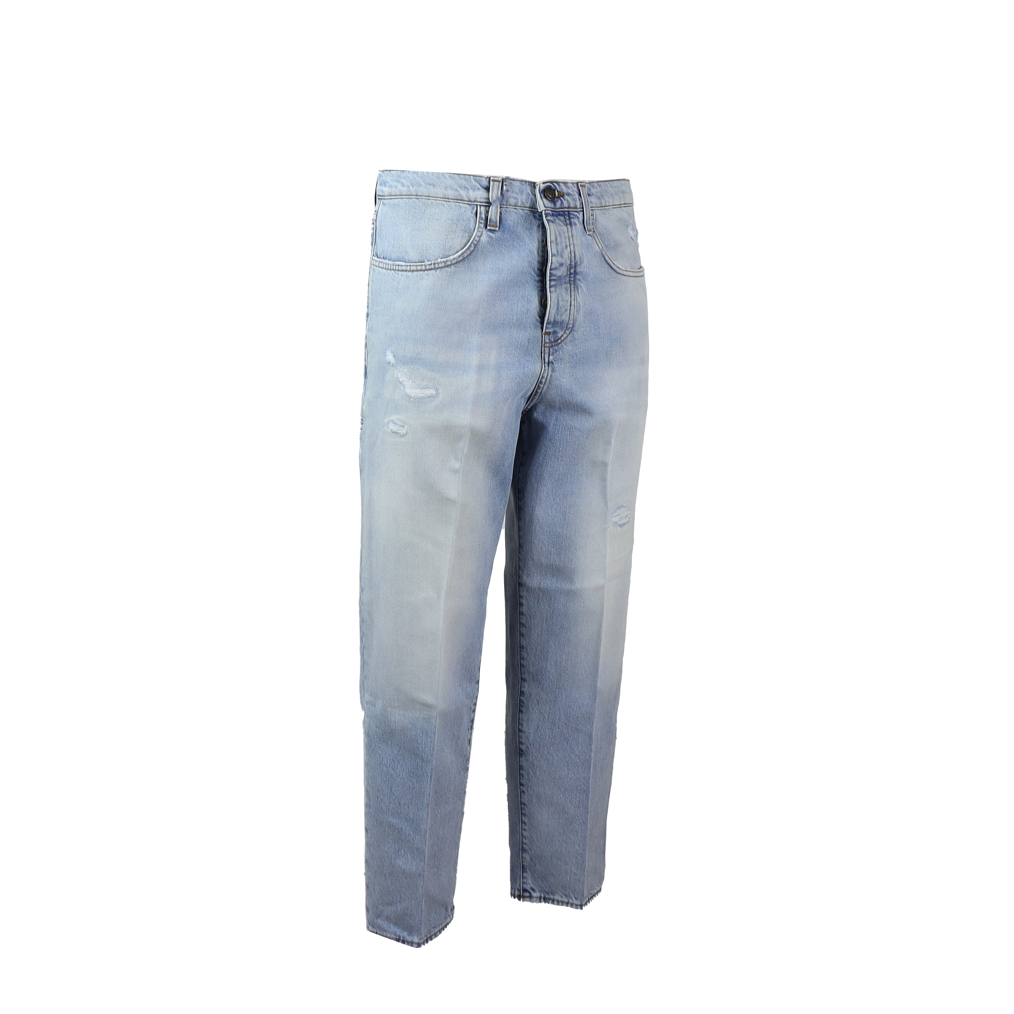Light OSAKA jeans by BONHEUR MILANO in cotton with 5-pocket style with abrasions, button closure. Japan fit, bottom 17.5 cm in size 30/44.