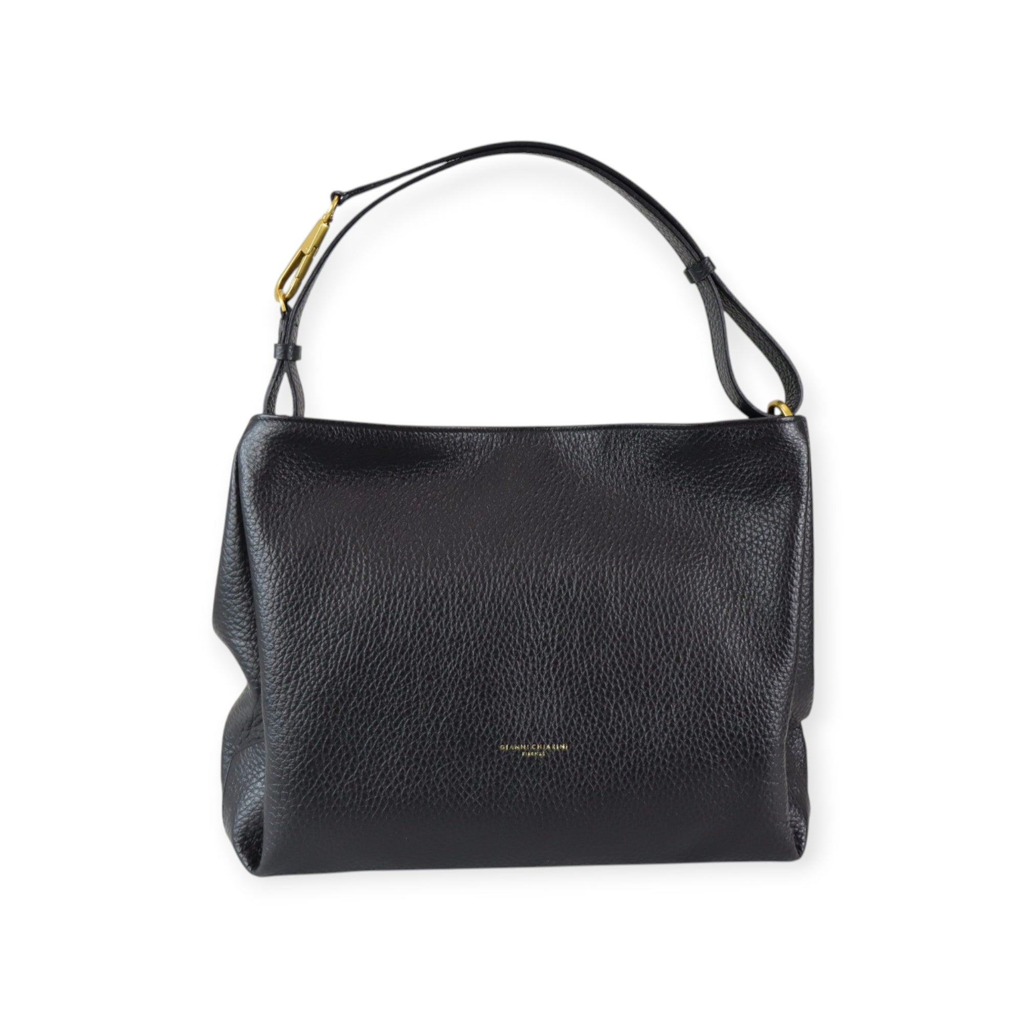 GIANNI CHIARINI black shoulder bag in hammered leather, shoulder strap with metal accessories, zip closure. Measures 38x28x14 cm.