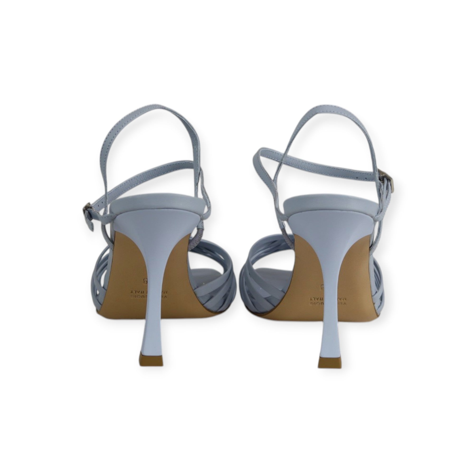 Light blue GIANMARCO F. leather sandals with ankle strap buckle, slightly square toe, 95mm heel.