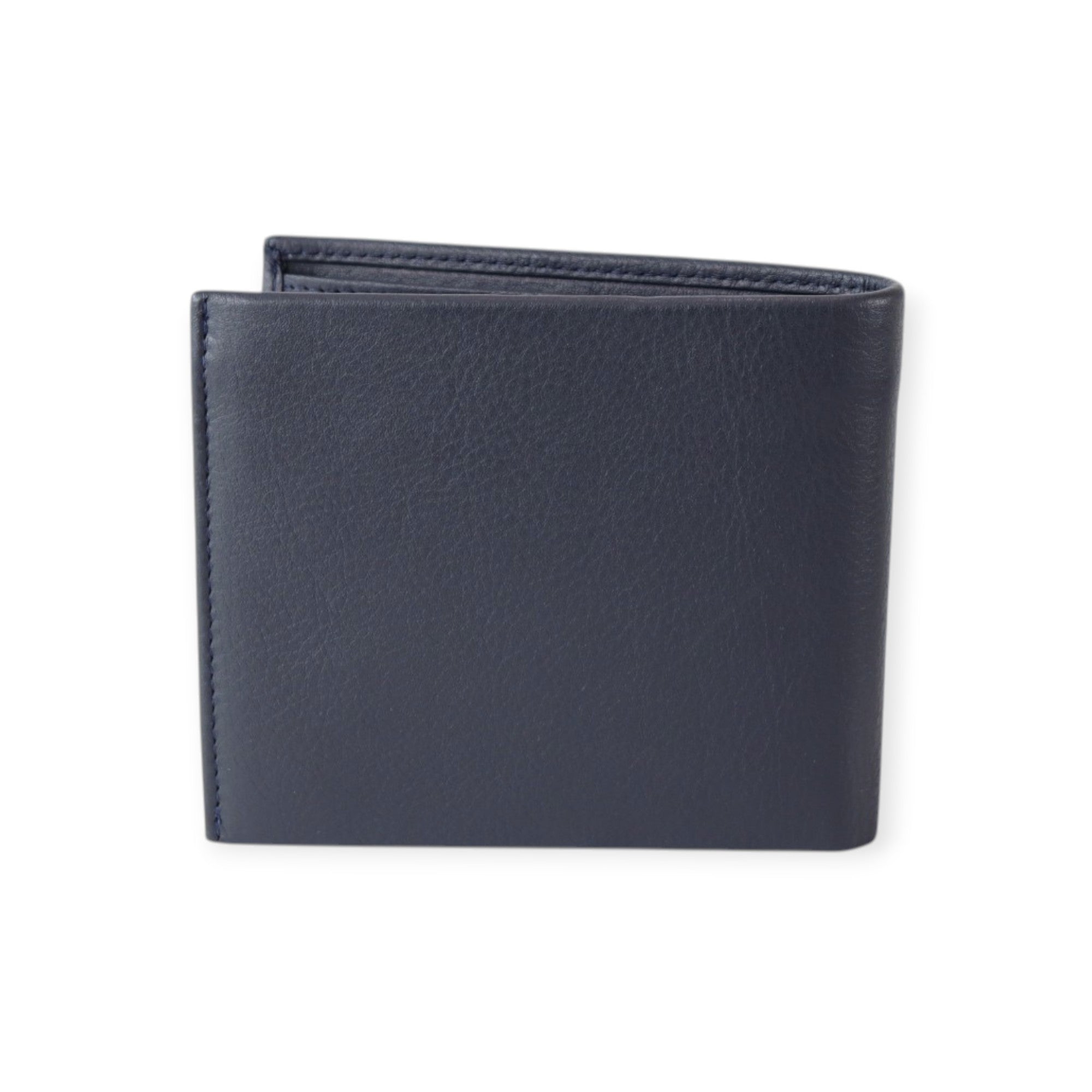 MOMO DESIGN blue leather wallet with coin and card compartments, metal logo. Dimensions 12x10x3cm.