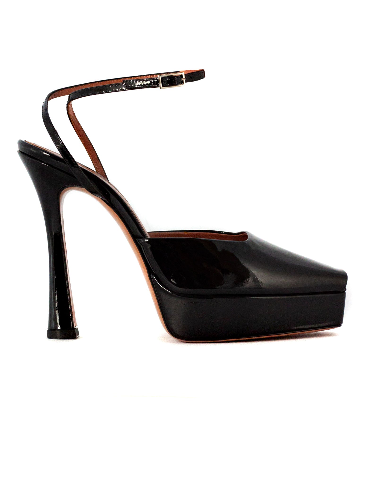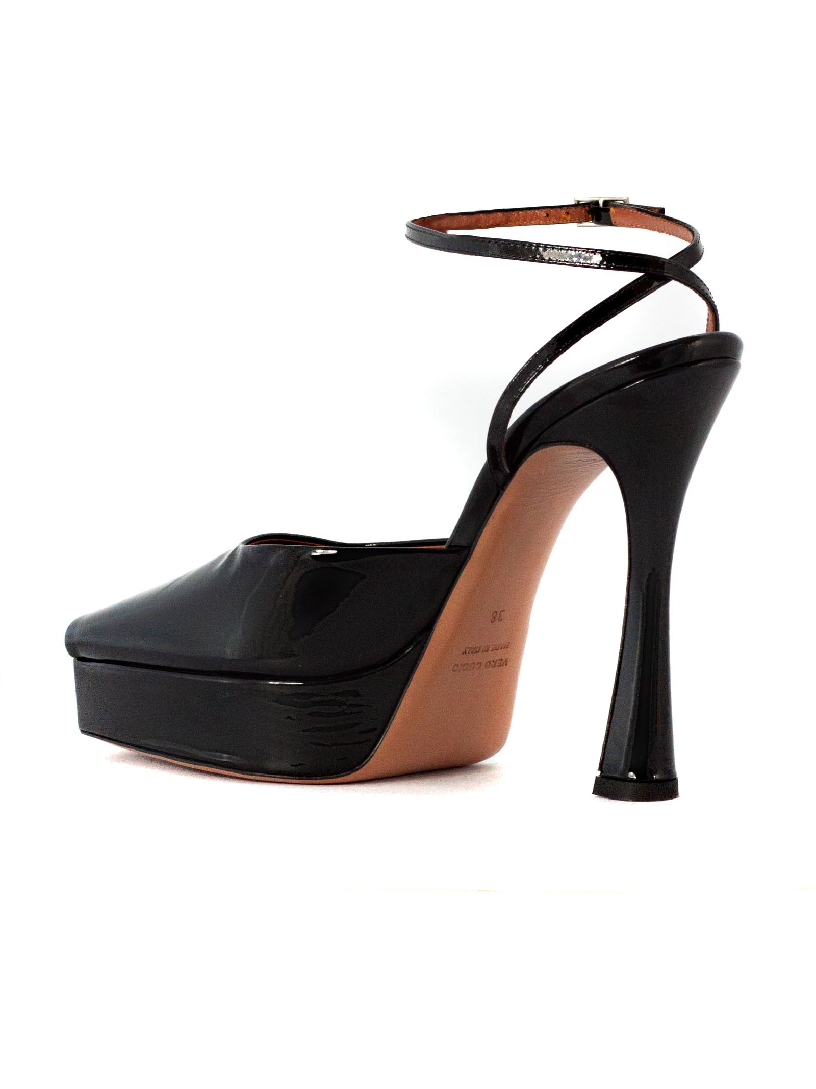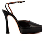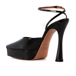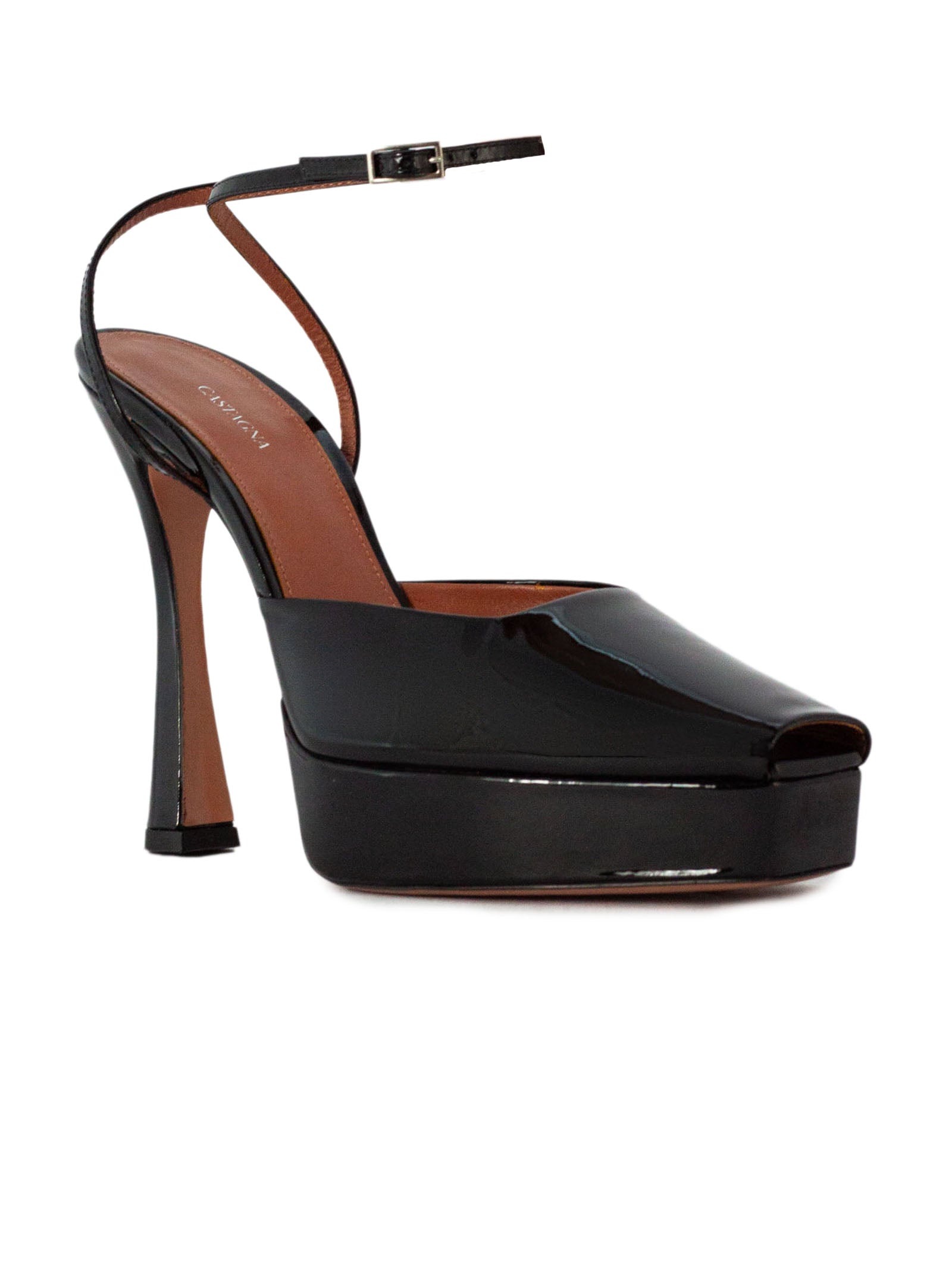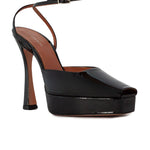 Sandalo VICKY nero di CASTAGNA in vernice con cinturino alla caviglia, spuntato, tacco 130mm e plateau 40mm, fondo in cuoio.
