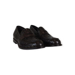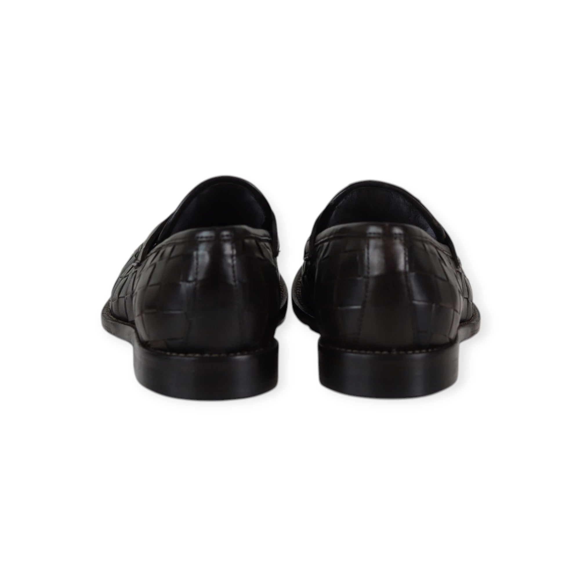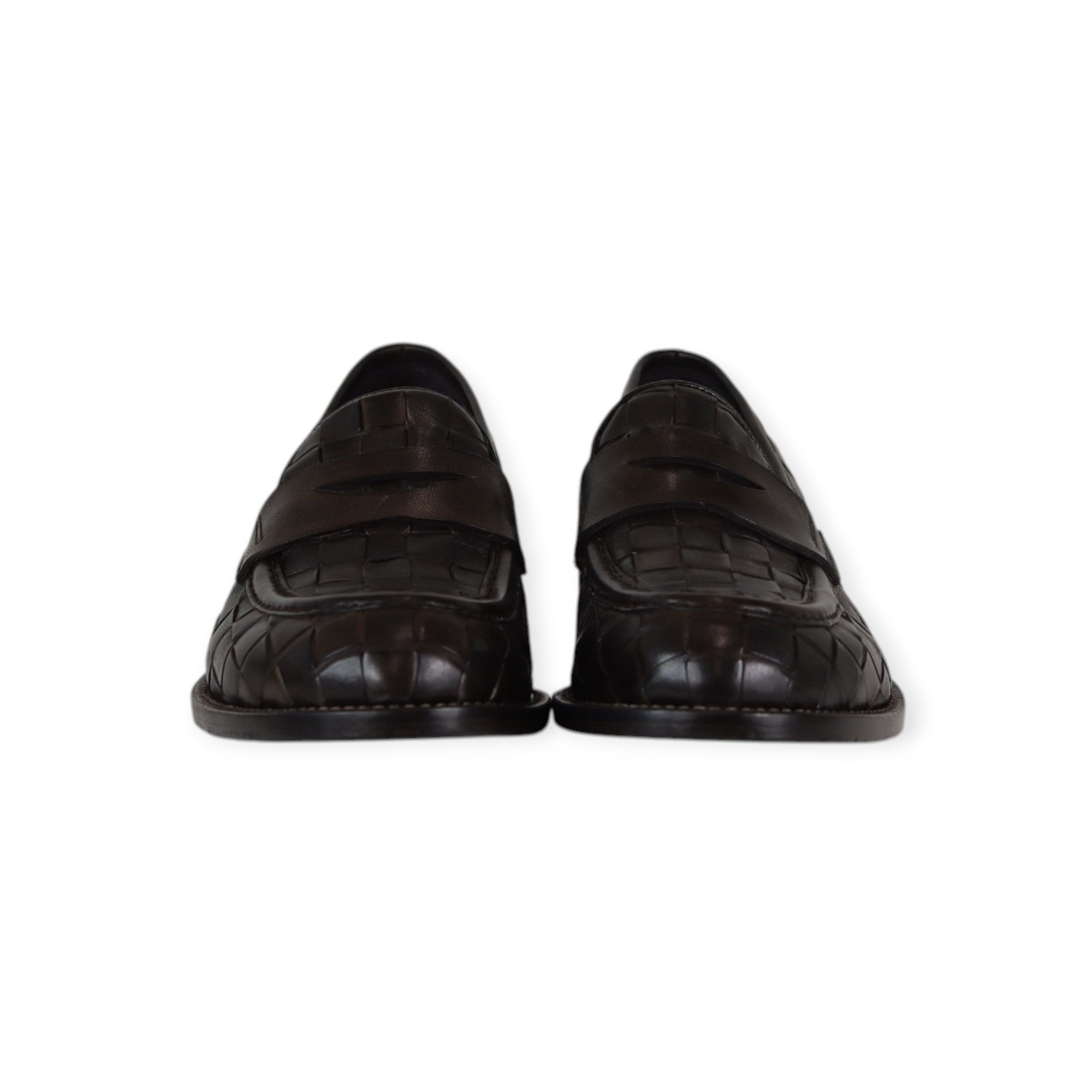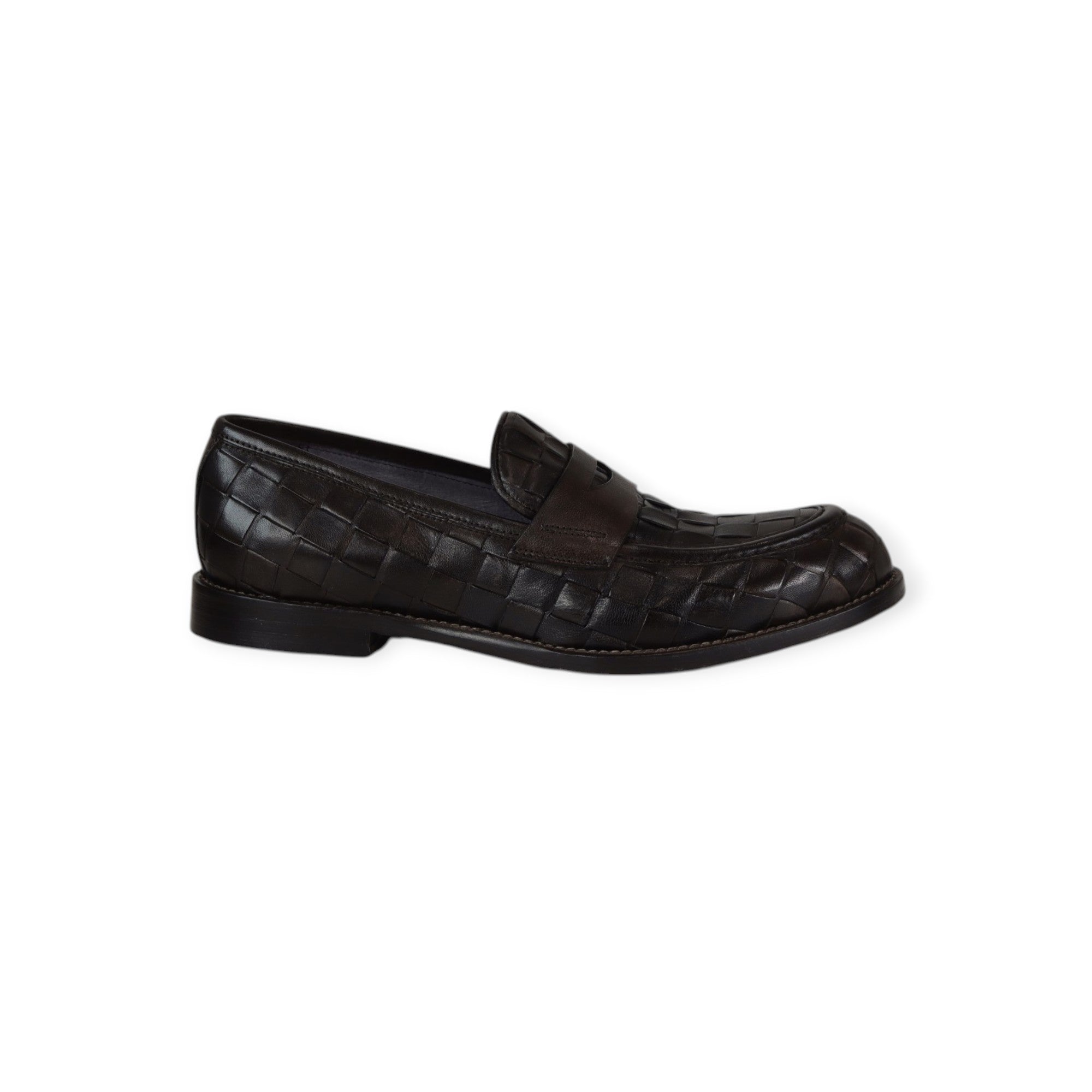 JP DAVID brown woven leather loafers with a vintage effect, matching leather band, and leather sole with injected rubber.