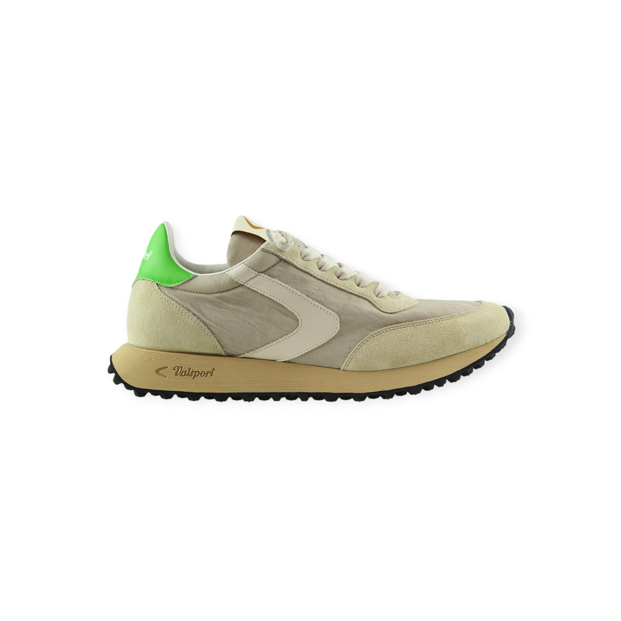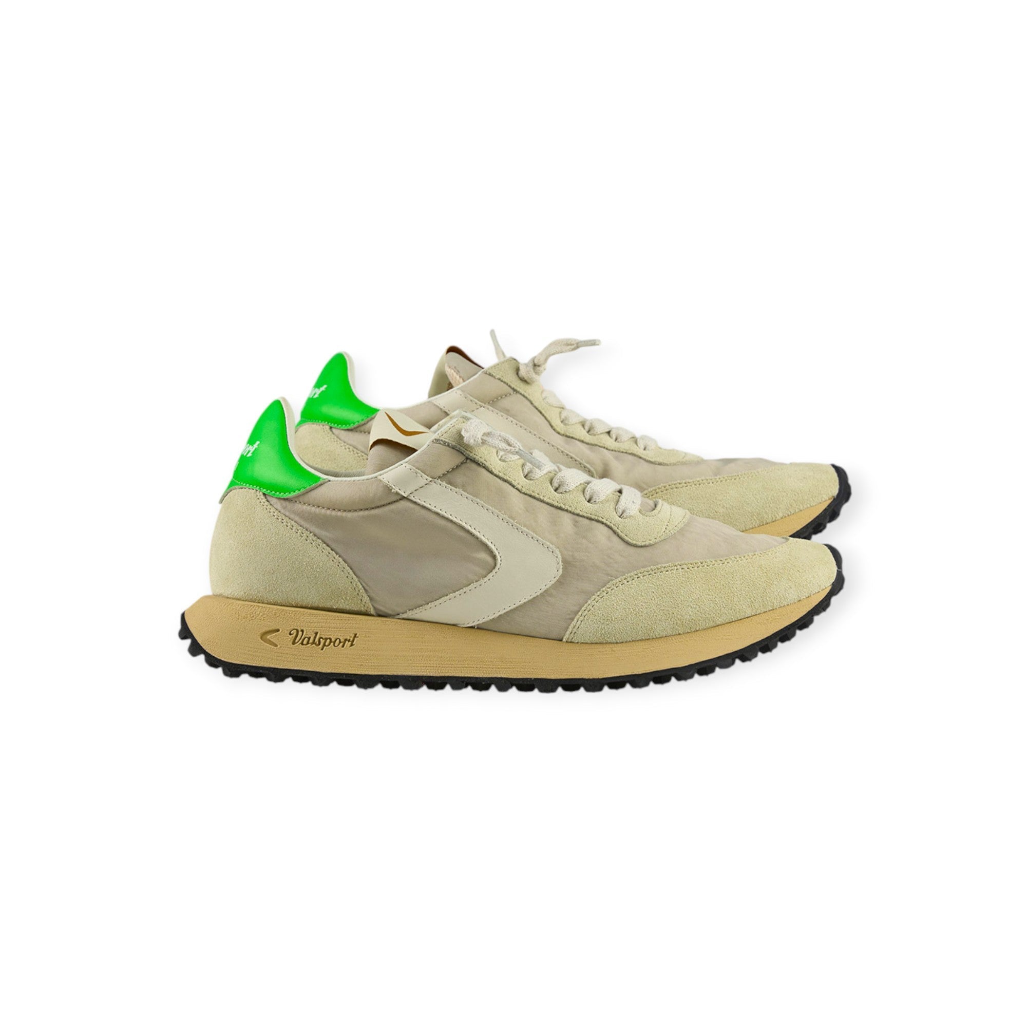 Running START HERITAGE beige di VALSPORT in camoscio con tomaia in tessuto in tinta, boomerang in pelle beige, talloncino posteriore in verde. Fondo in gomma.