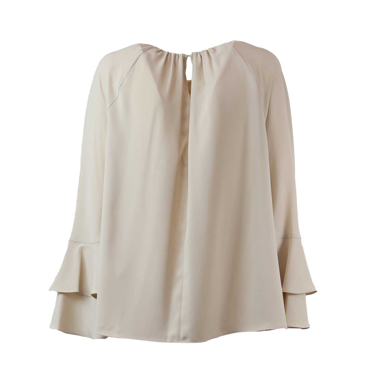 Blusa MARIN beige di IBLUES in poliestere con maniche lunghe, rouches su maniche, collo a giro ampio, e chiusura con bottone posteriore. Fit ampio.