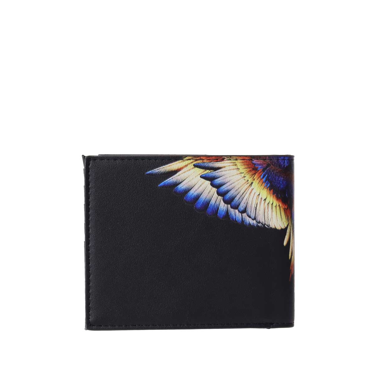 Portafogli nero di COUNTY OF MILAN MARCELO BURLON in ecopelle con scomparti per banconote e carte, stampa ali multicolor con gradazione gialla. Misure 11x9x2 cm.