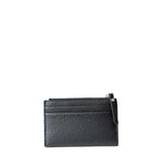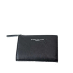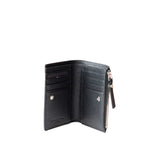 Portafoglio nero di GIANNI CHARINI in pelle con effetto martellato, chiusura con bottone, scomparto per banconote e carte e per monete con chiusura con zip, logo a fuoco in colore argento. Misure 13x8x2 cm.