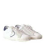 Sneakers PARIS bianca di PHILIPPE MODEL in pelle con tallone in camoscio blu, logo in pelle bianca con profilo in camoscio blu e fondo in gomma bianca con leggero effetto used.