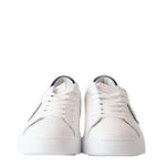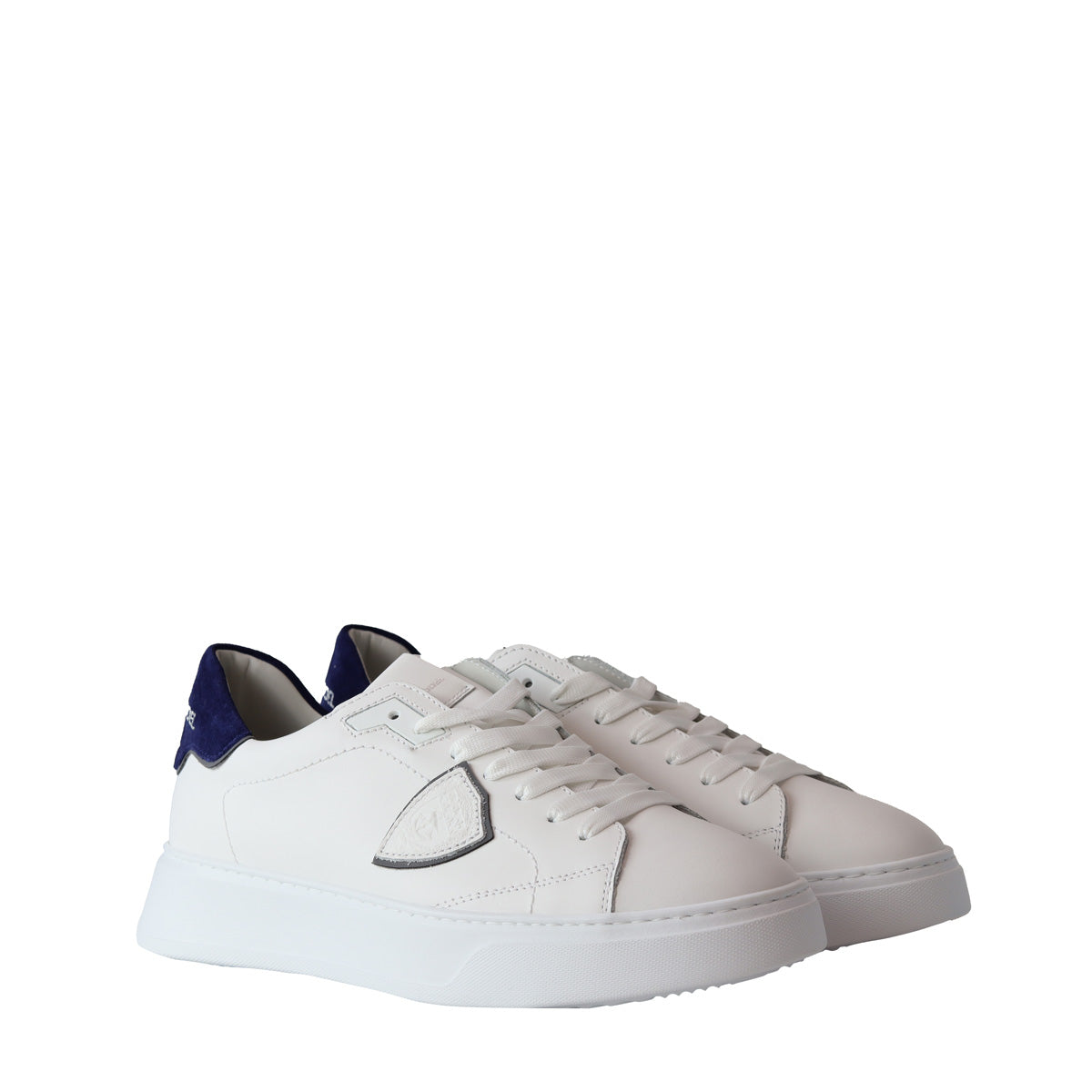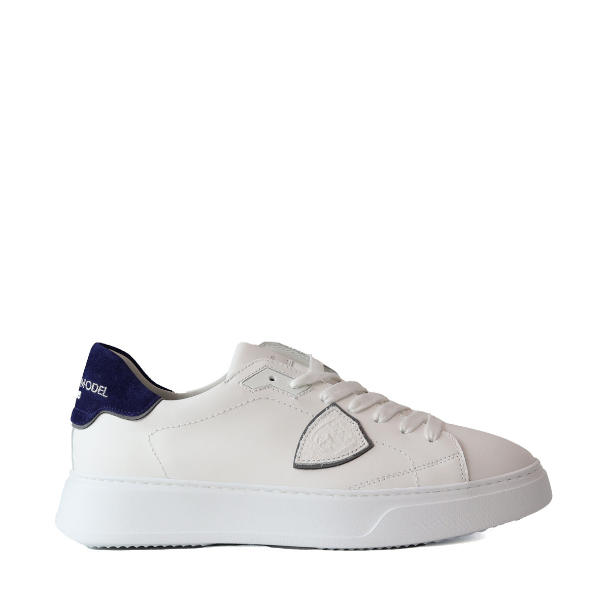 Sneakers TEMPLE bianca di PHILIPPE MODEL in pelle con tallone in camoscio blu con profilo in grigio, logo in tinta con profilo in blu e fondo in gomma bianca.