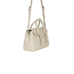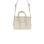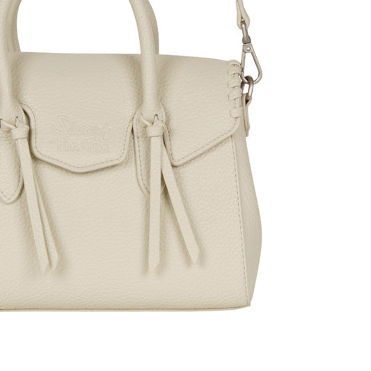 Borsa a mano piccola con patta latte LAYA SMALL di SECRET PON PON in ecopelle effetto bottalato. La borsa si compone di una tracolla in pelle e chiusura con clip e dettaglio sulla patta con intreccio. All'interno è dotata di 3 scomparti, uno contenente due taschini aperti, uno contenente un taschino chiuso con zip e uno scomparto chiuso con zip. Misure 24x18x13