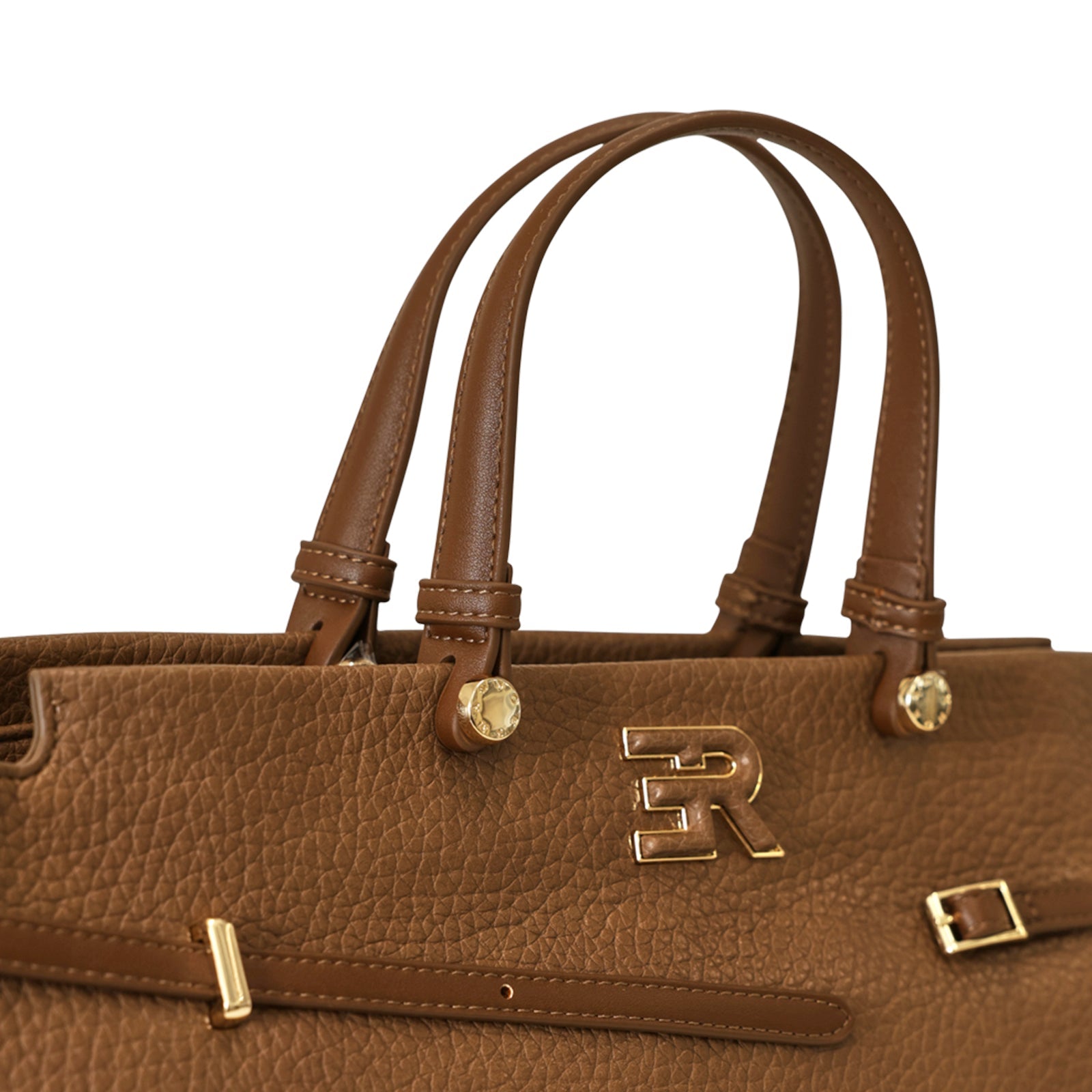 Borsa a mano UNITY cuoio di ERMANNO SCERVINO in ecopelle con effetto bottalato, doppio manico, logo coi profili in metallo oro e chiusura con zip. Misure 35x23x13 cm.
