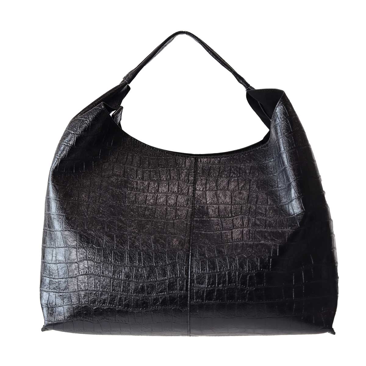 Borsa a spalla VERONICA nera di ERMANNO SCERVINO in ecopelle con stampa cocco, logo in metallo oro e un manico. Misure 40x38x10 cm.