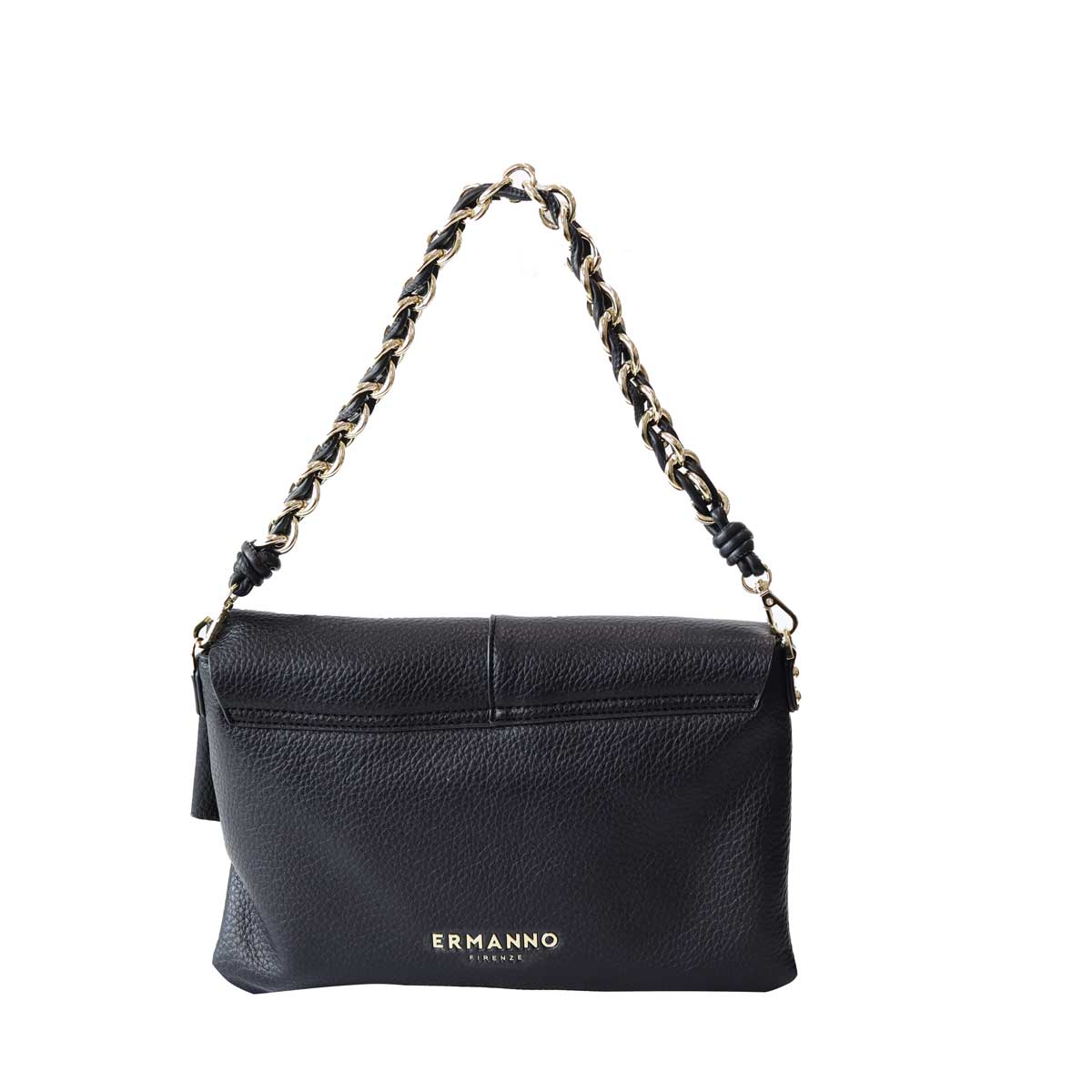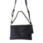 Borsa a tracolla EBA nera di ERMANNO SCERVINO in ecopelle con chiusura con bottone con patta, tracolla con catena in metallo oro, tracolla interna in pelle, logo in metallo anteriore in beige e logo in metallo oro posteriore. Misure 30x20x2 cm.