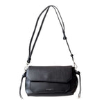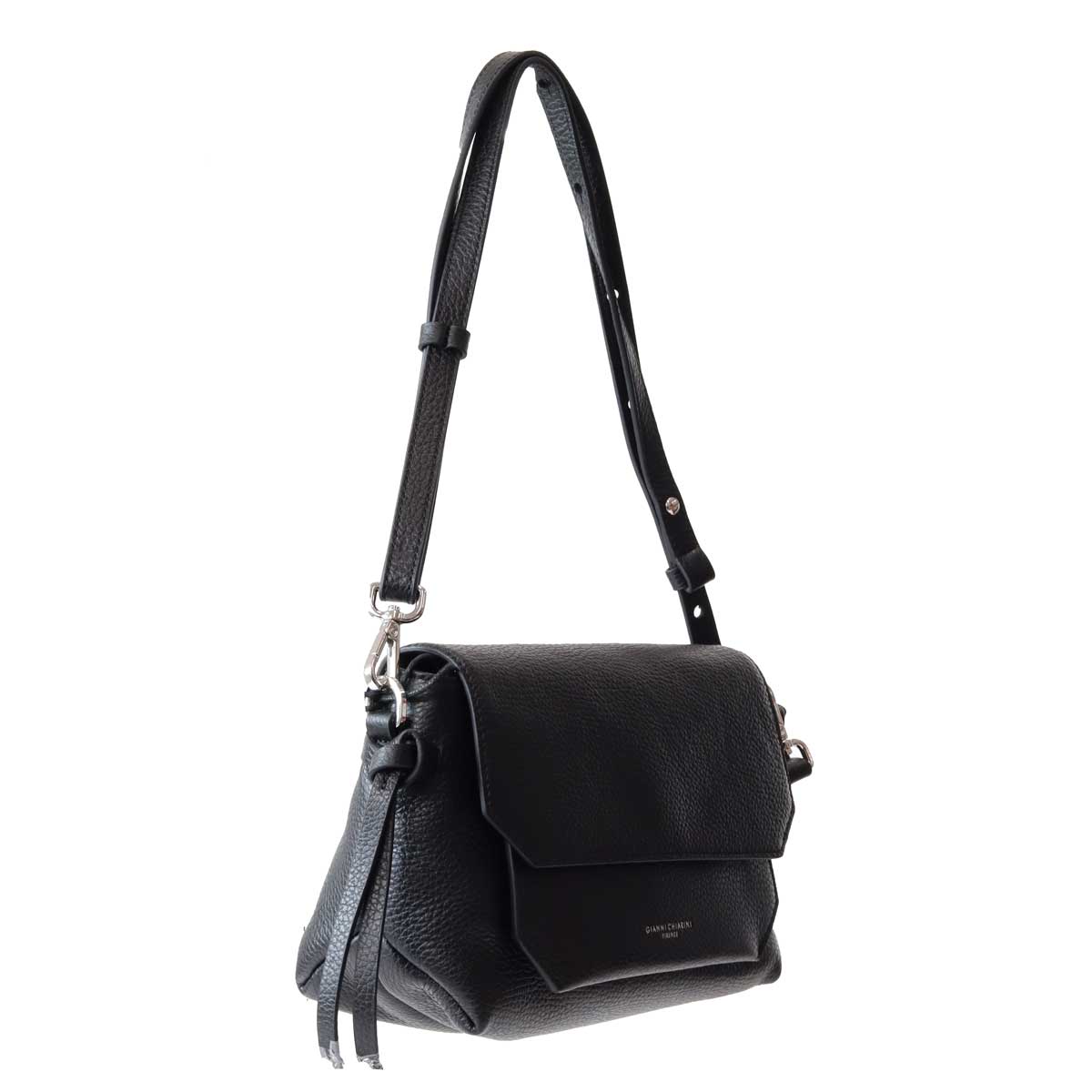 Borsa a tracolla nera di GIANNI CHARINI in pelle con effetto martellato, chiusura con patta, logo a fuoco in color argento, tracolla in pelle nera. Misure 23x16x10 cm.