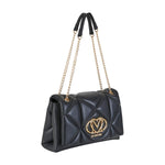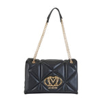 Borsa a tracolla nera di LOVE MOSCHINO in ecopelle con effetto nappa trapuntato, chiusura con patta, logo in metallo oro, manici con catena. Misure 28x20x9 cm.