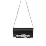 Pochette nera in ecopelle di SCARLETT con patta arricchita da dettaglio nodo con strass con chiusura a clip. Tracollina a catena color argento. Misure 21x12x6 cm