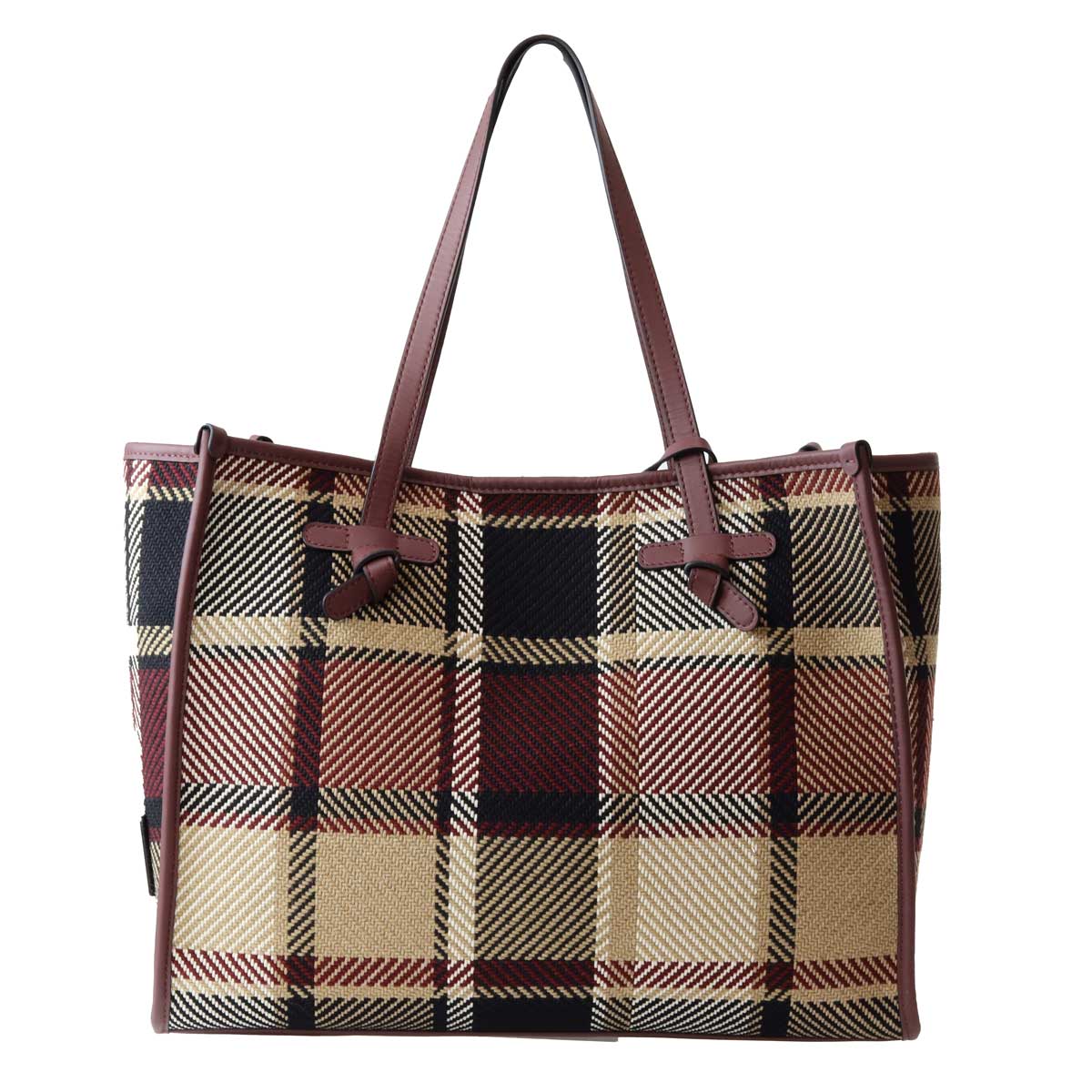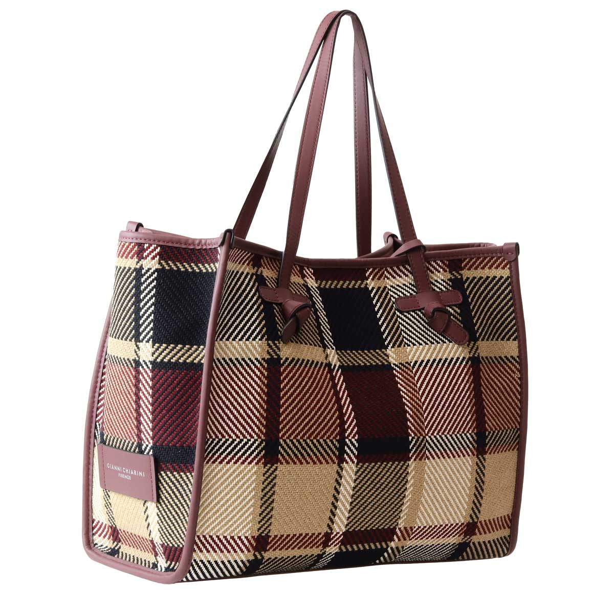 Shopping a quadri di MARCELLA CLUB GIANNI CHIARINI in canvas con fantasia a quadroni in beige e bordeaux, profili in pelle bordeaux, doppio manico in pelle bordeaux, pochette interna in pelle bordeaux. Misure 39x30x15 cm.