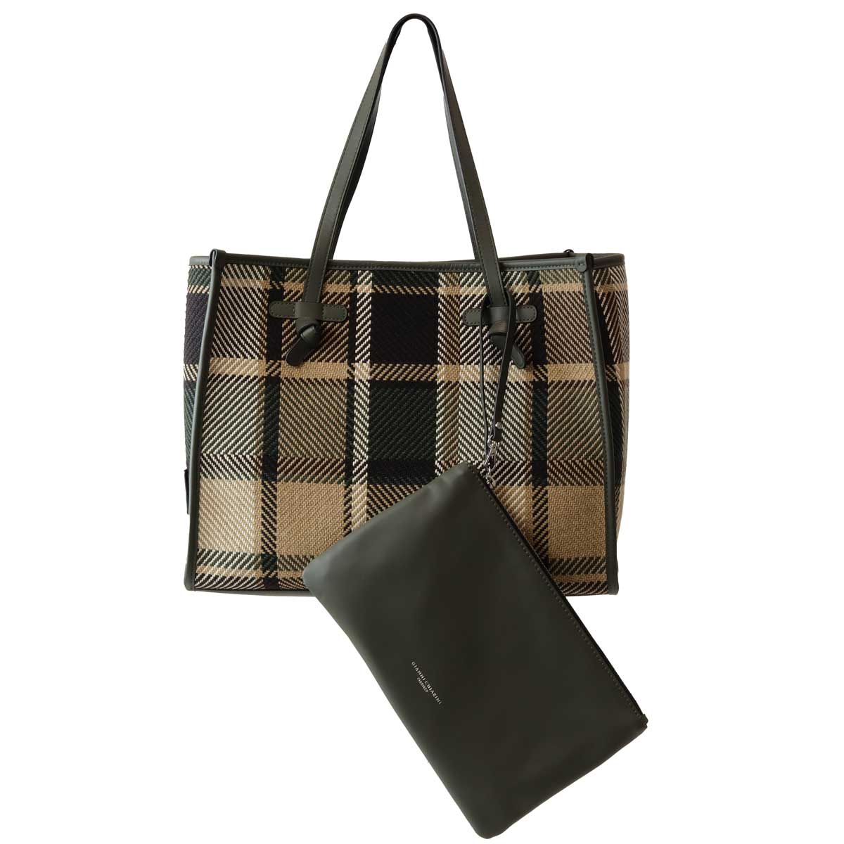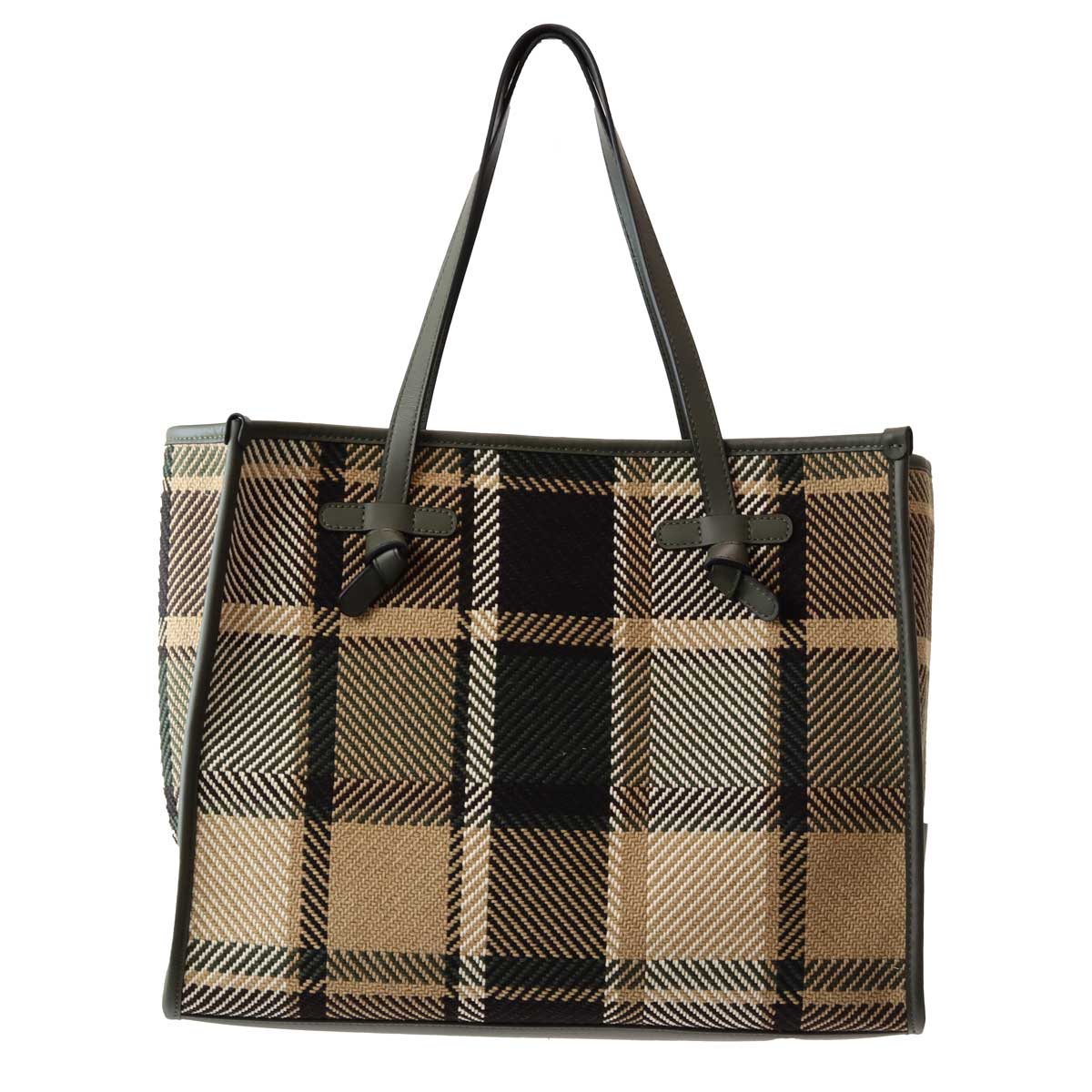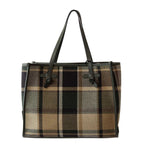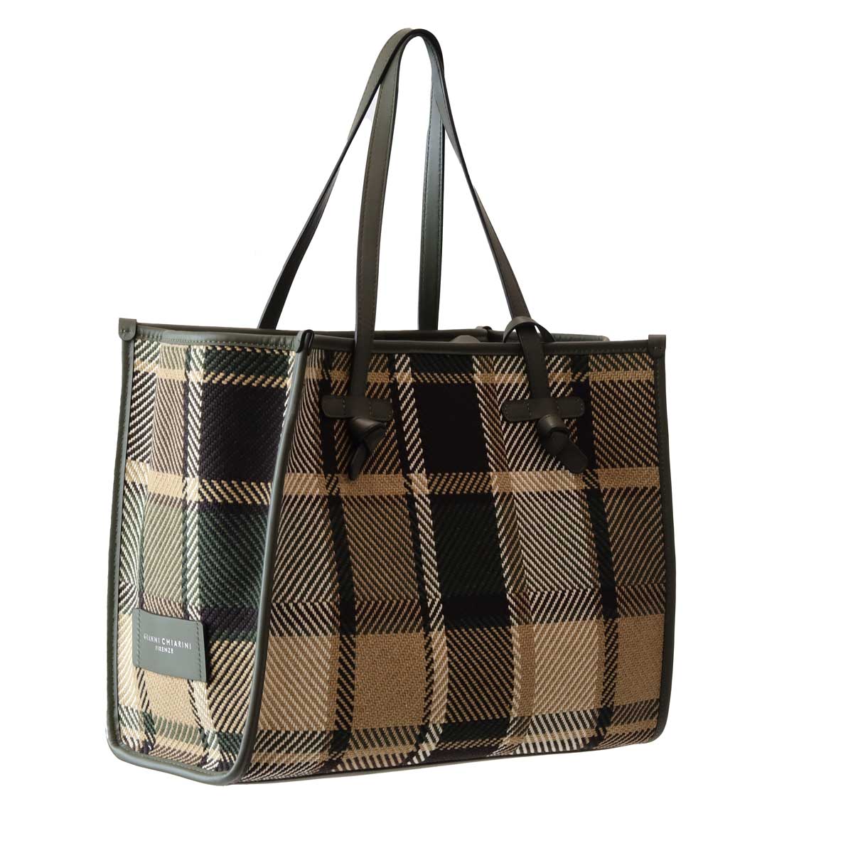 Shopping a quadri di MARCELLA CLUB GIANNI CHIARINI in canvas con fantasia a quadroni in beige e verde, profili in pelle verde, doppio manico in pelle verde, pochette interna in pelle verde. Misure 39x30x15 cm.