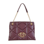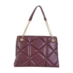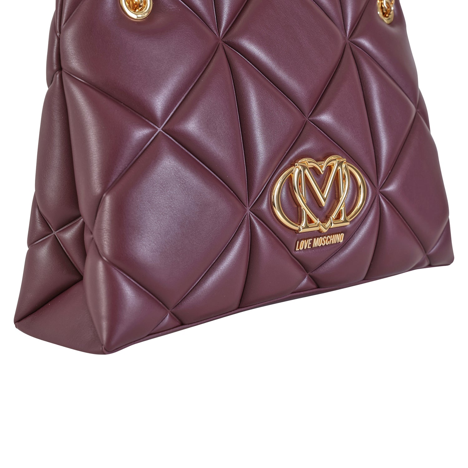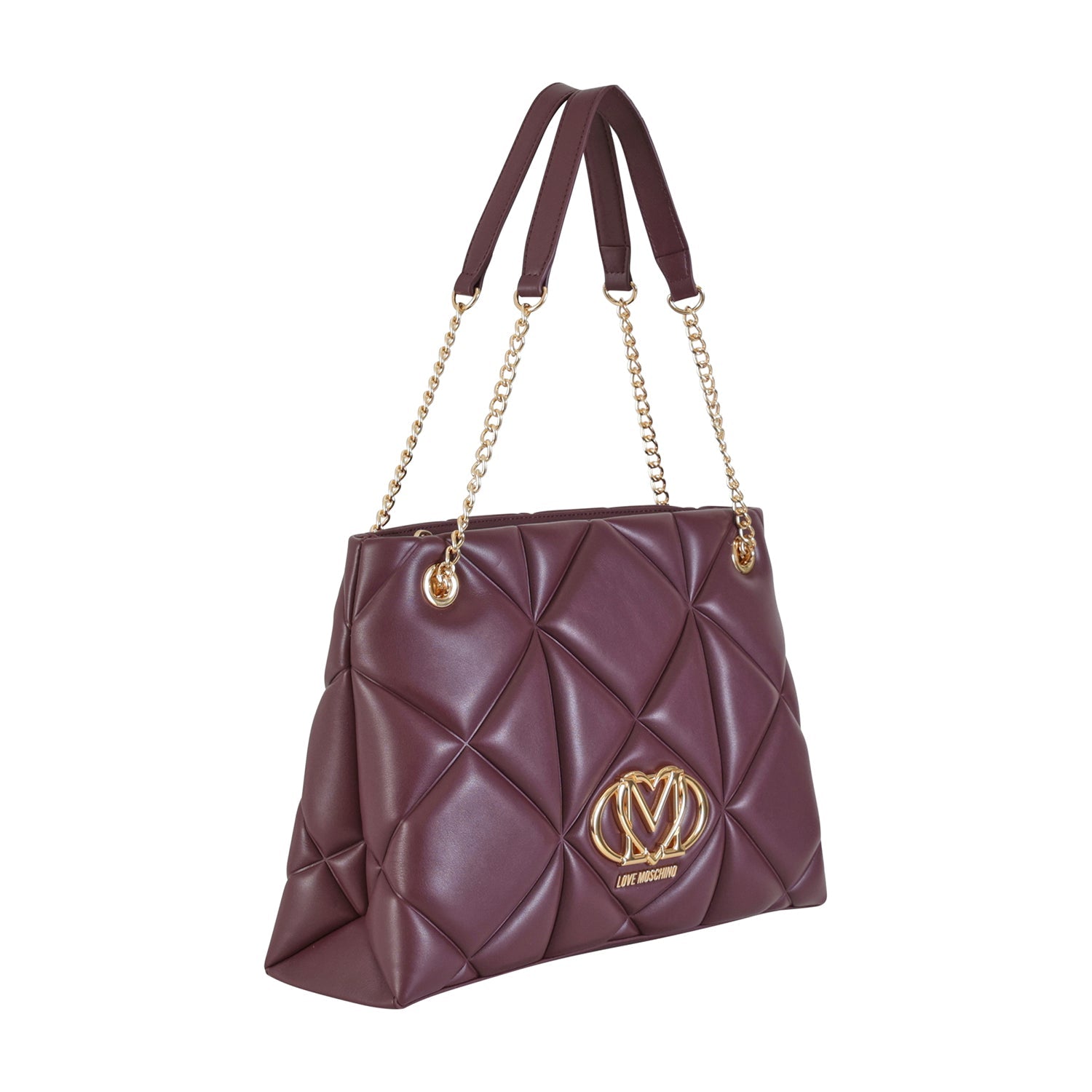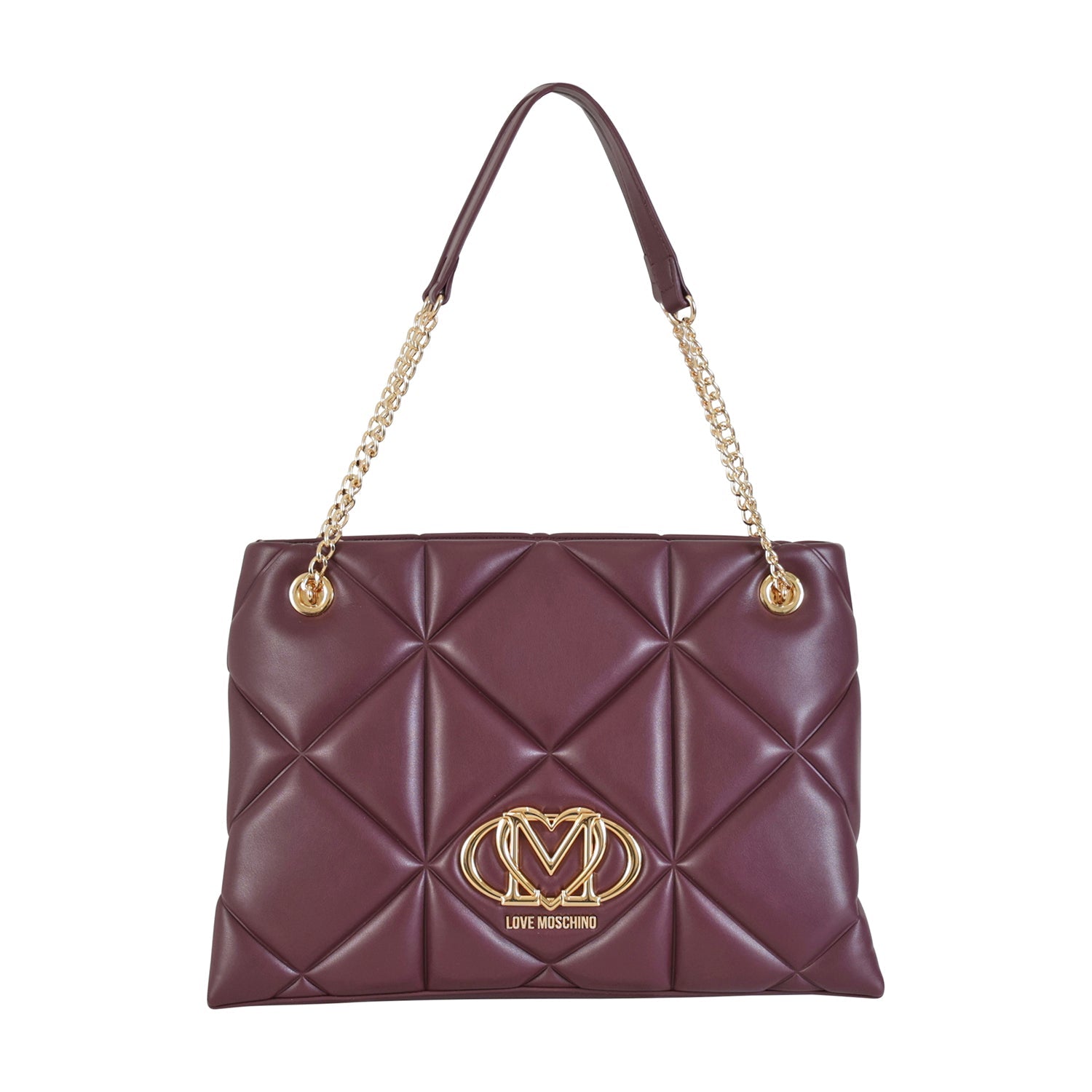 Shopping bordeaux di LOVE MOSCHINO in ecopelle con effetto nappa trapuntato, logo in metallo oro, manici con catena. Misure 35x25x11 cm.