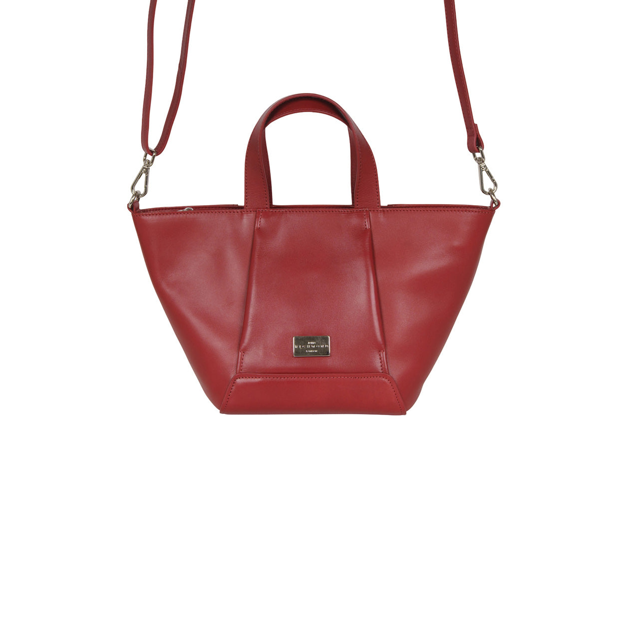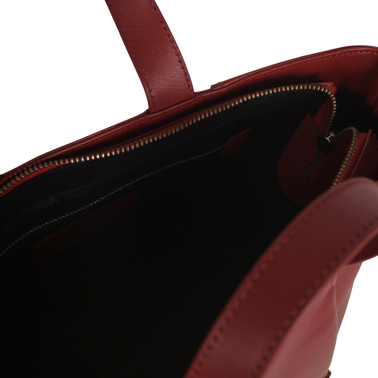 Shopping rossa di RICHMOND in pelle con doppio manico, chiusura con zip, logo ed accessori in metallo oro e tracolla interna. Misure 35x21x13cm.