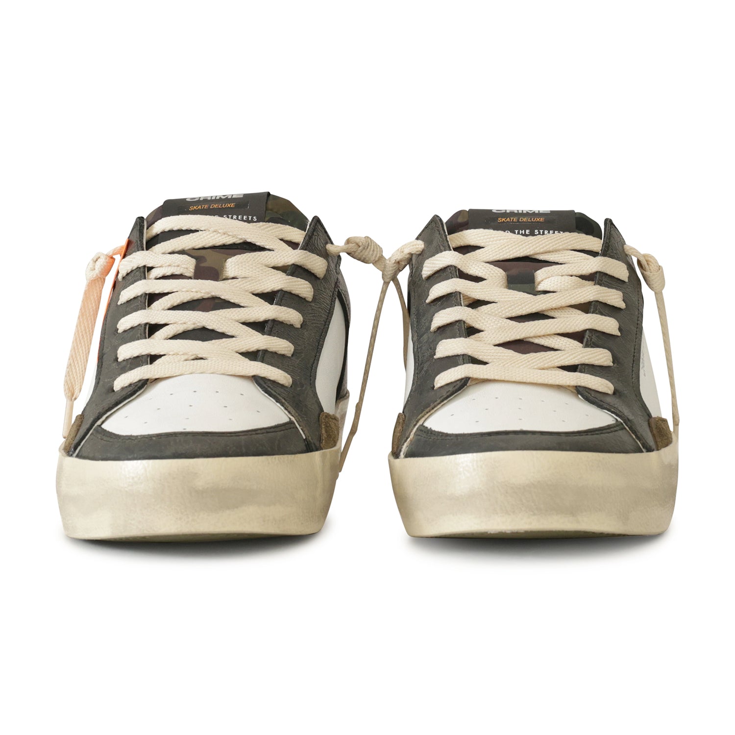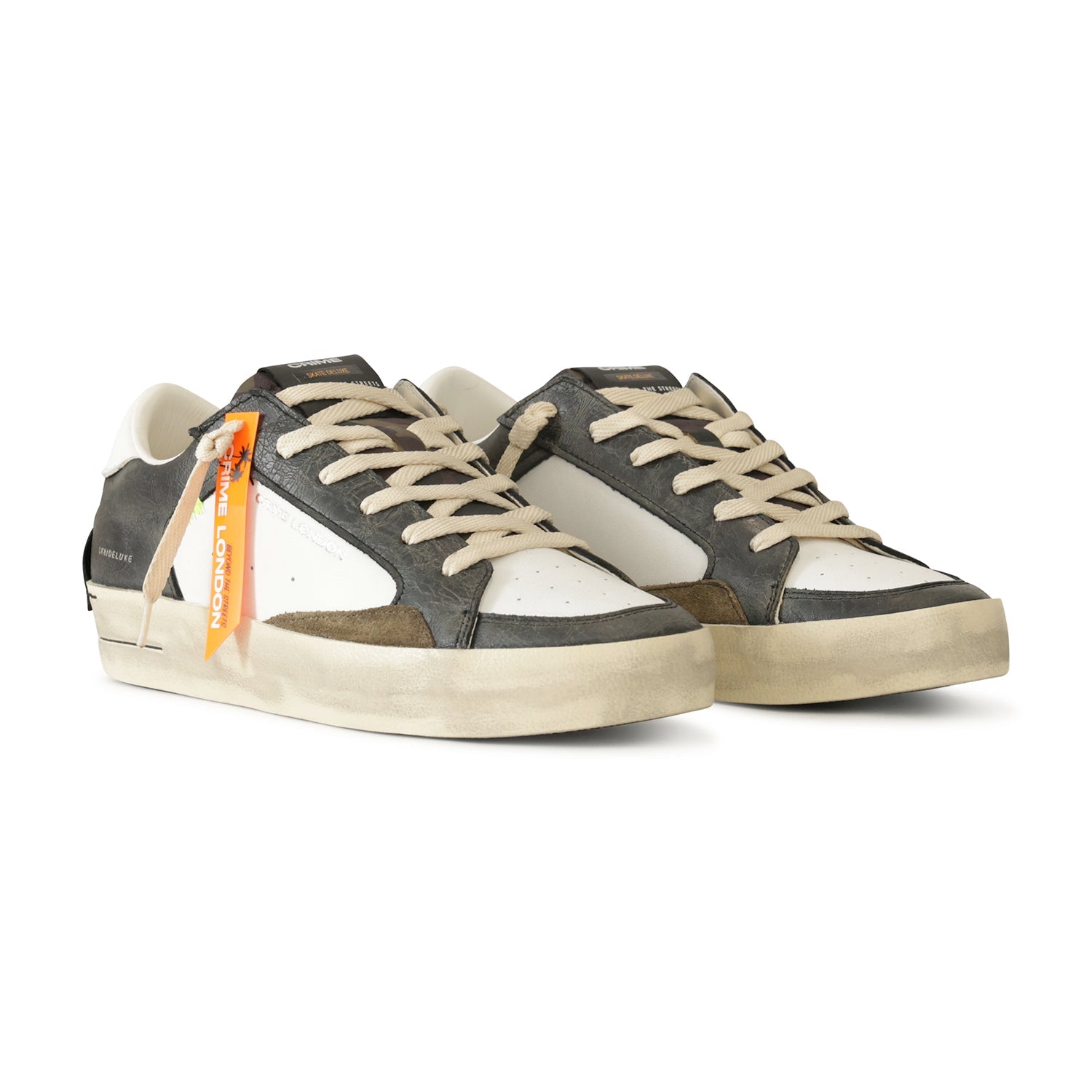 Sneakers DISTRESSED nera di CRIME in pelle con effetto crackele, riporto in pelle bianca, profili in camoscio beige, tallone in pelle bianca, linguetta in tessuto camouflage. Fondo in gomma.