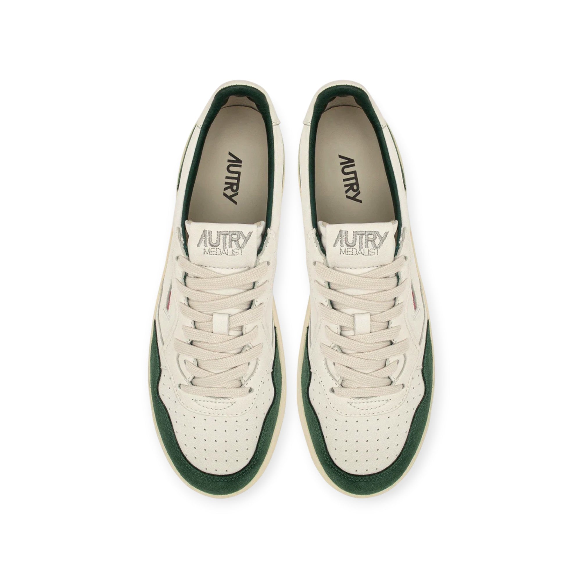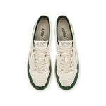 Sneakers MEDALIST bianca di AUTRY in pelle con profili in camoscio verde, patch con logo laterale, punta traforata e fondo in gomma.