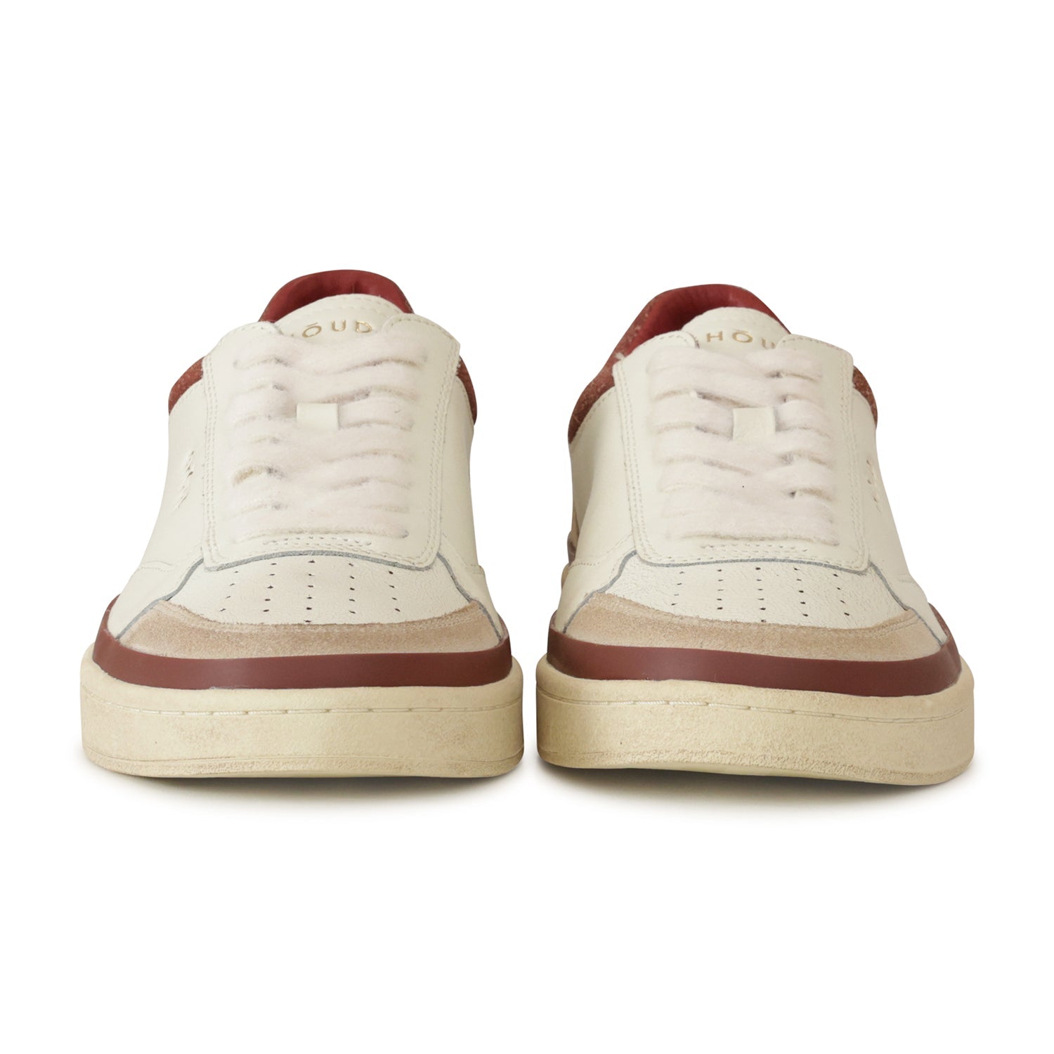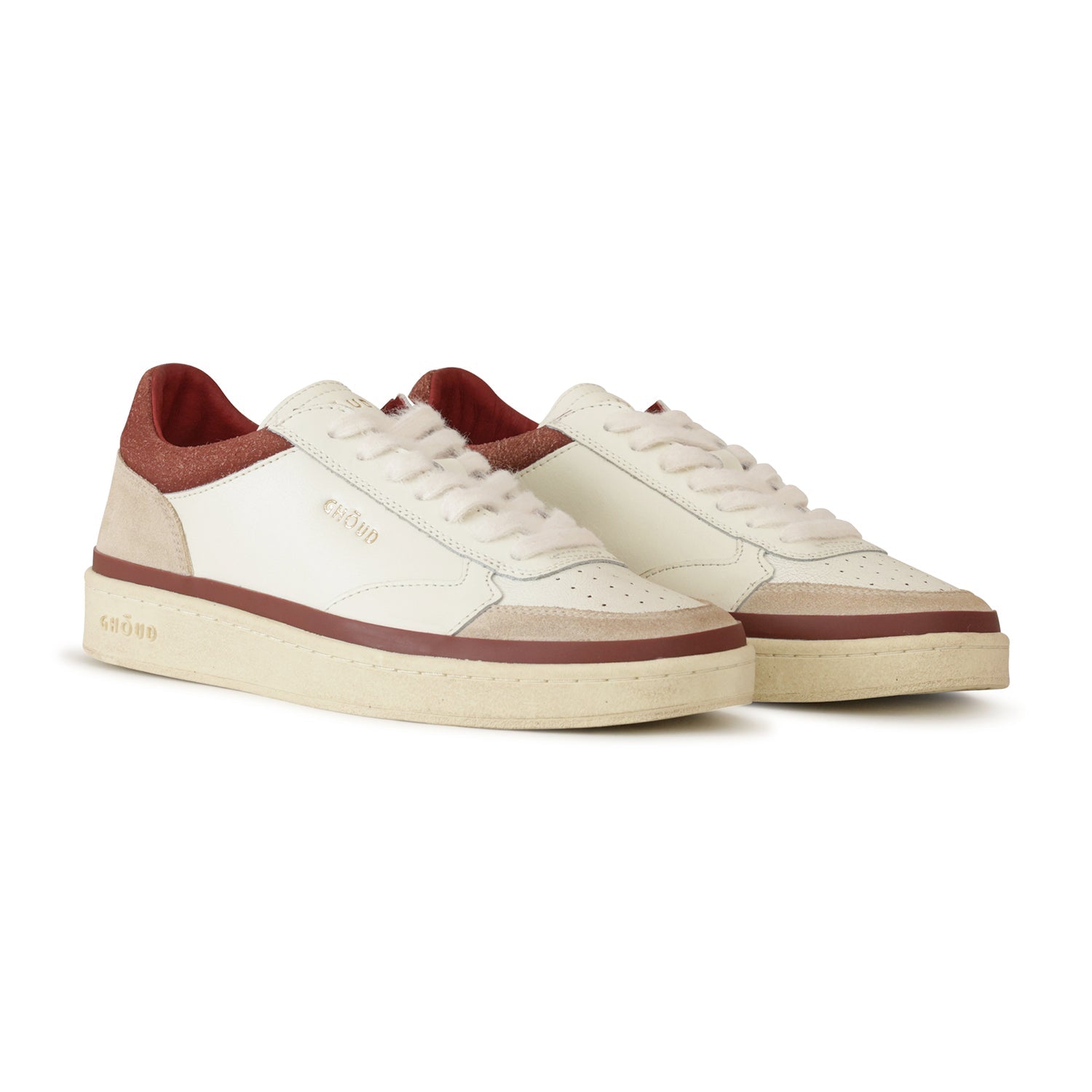 Sneakers PADS off white di GHOUD in pelle con punta microforata, collarino e profilo del fondo in bordeaux, profili in camoscio beige e fondo in gomma.