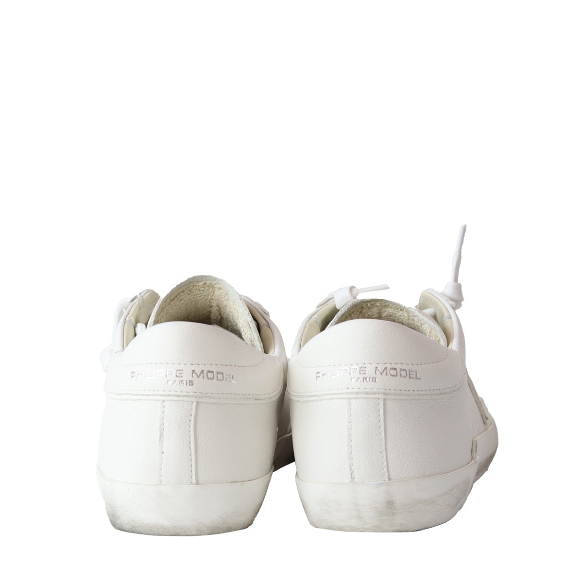 Sneakers PARIS bianca di PHILIPPE MODEL in pelle con logo in pelle bianca e fondo in gomma bianca con leggero effetto used.
