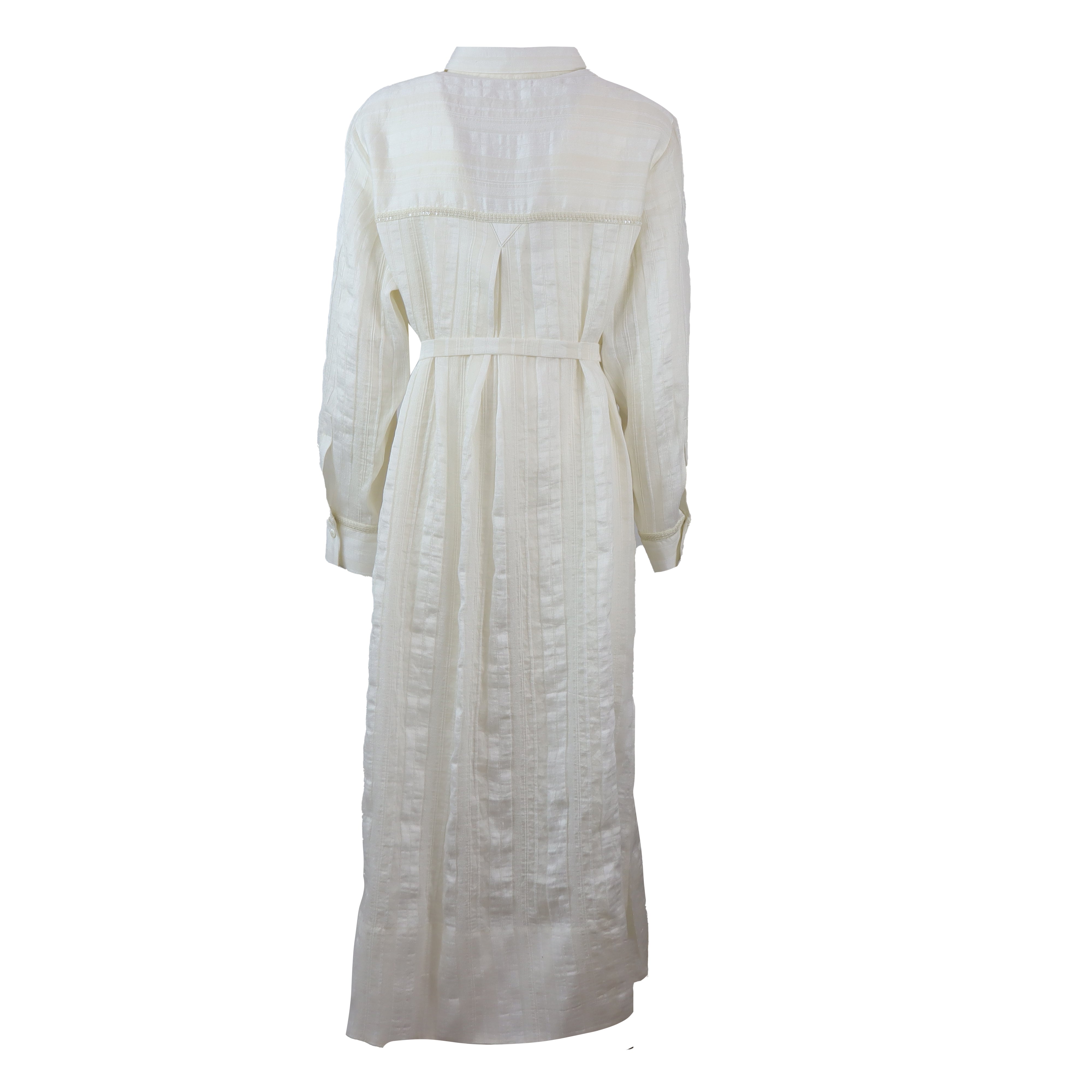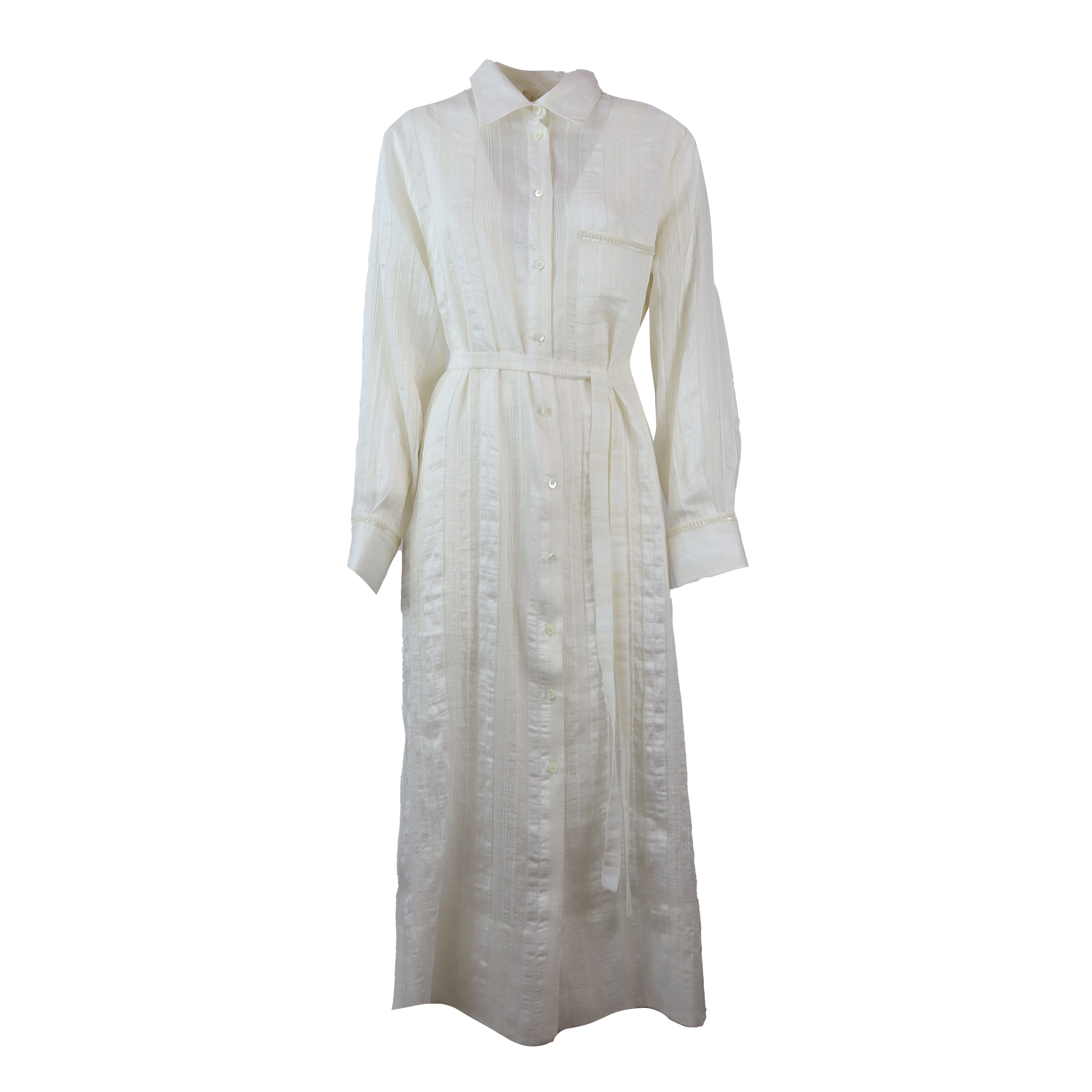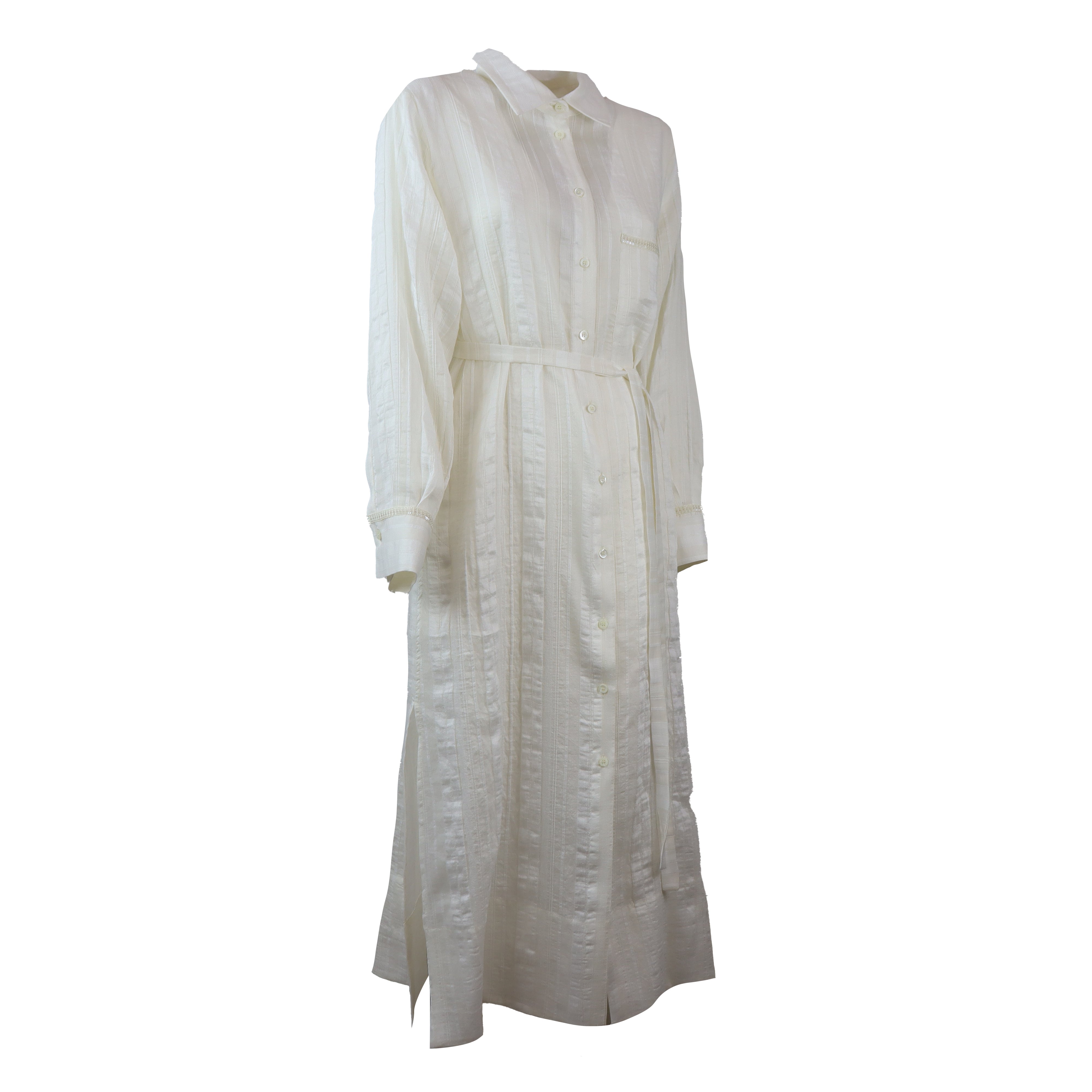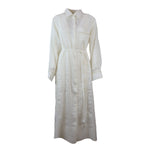 Abito VITTORIA bianco di HANAMI D'OR in misto lino con chiusura con bottoni, manica lunga, cintura in vita, collo camicia.