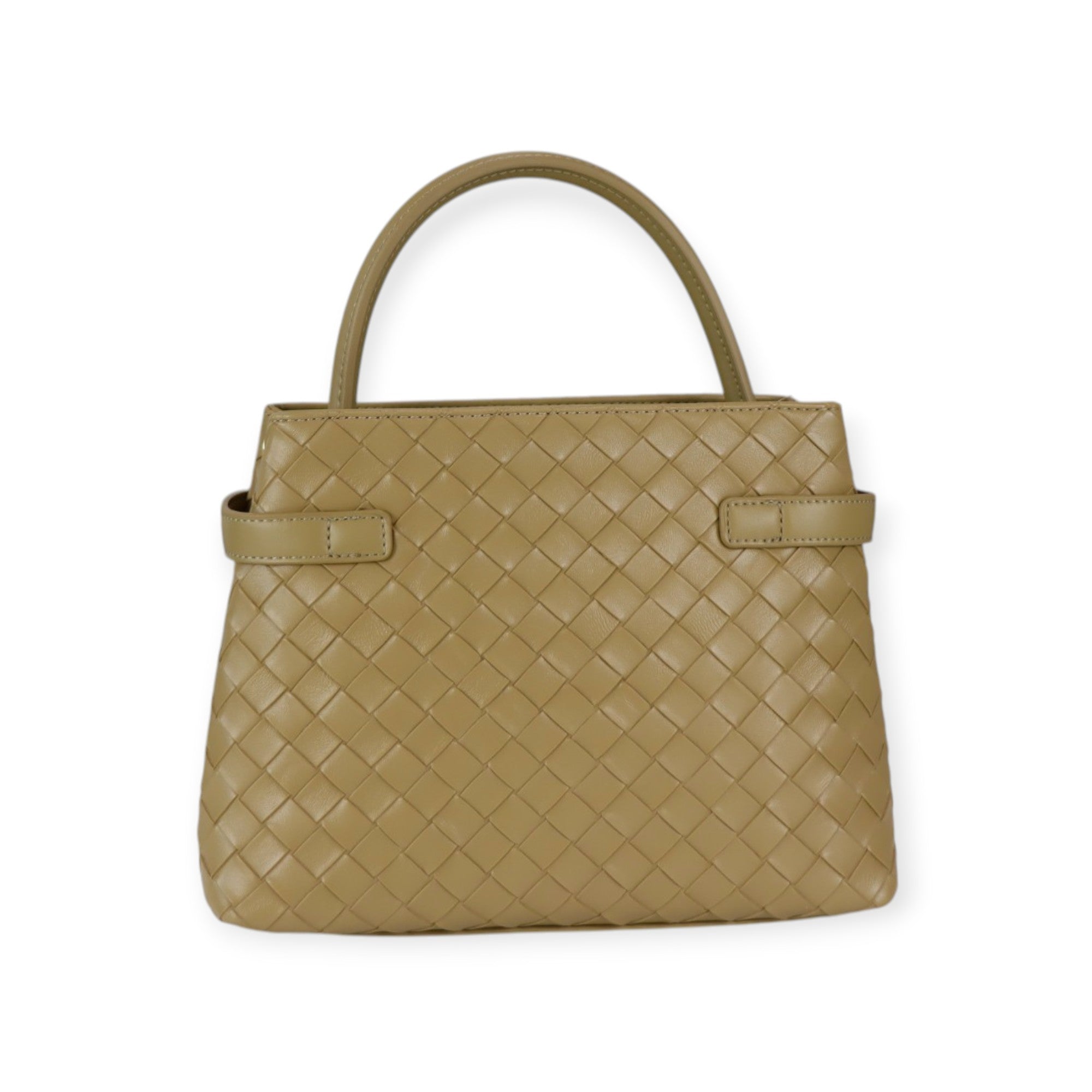 Borsa a mano ARIZONA cammello di MARC ELLIS in ecopelle con effetto intrecciato, manico singolo, chiusura con zip, accessorio in metallo, tracolla interna in tessuto. Misure 25x21x11 cm.