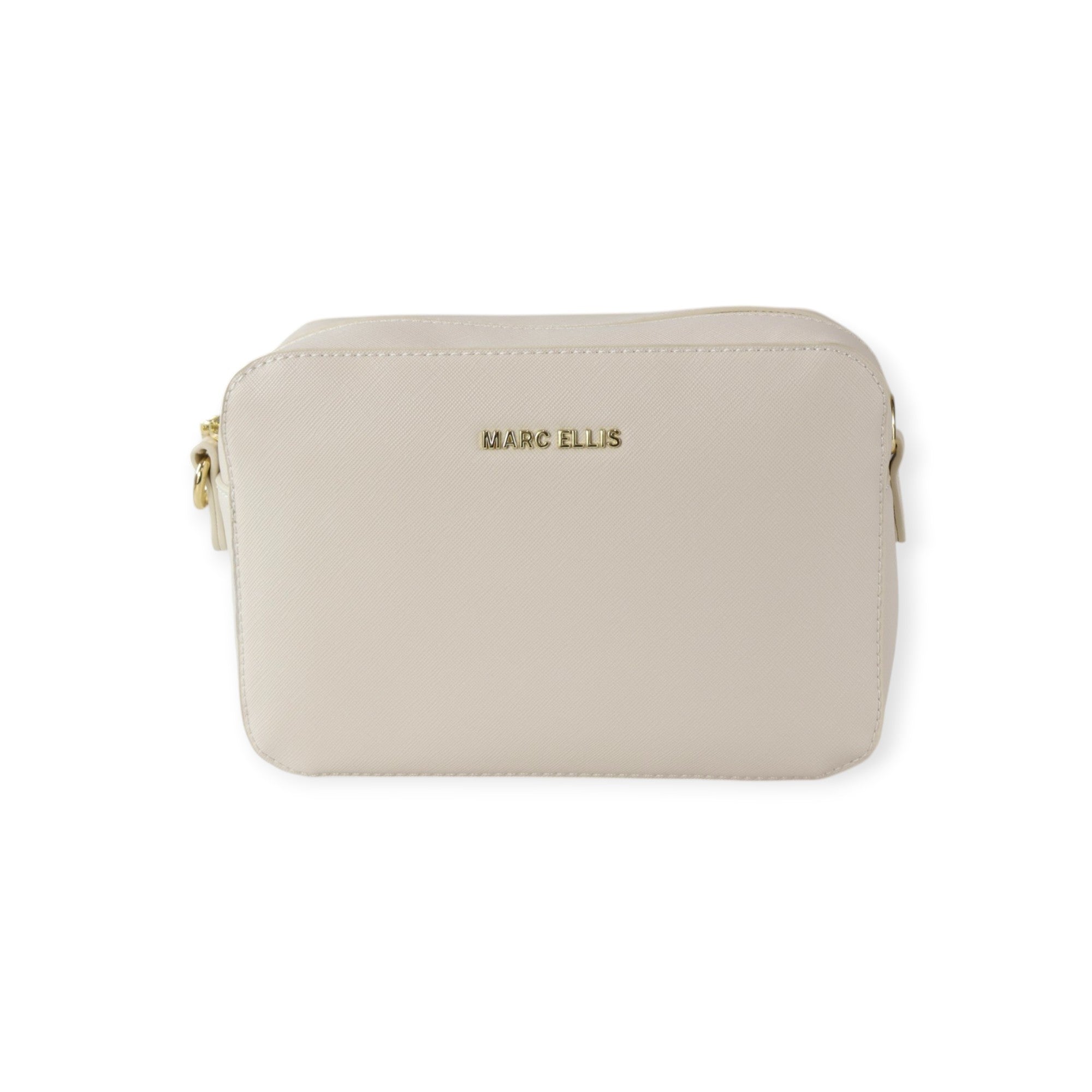 Borsa a tracolla PEYTON latte di MARC ELLIS in ecopelle con effetto saffiano, logo in metallo, chiusura con zip, tracolla in pelle e metallo. Misure 22x16x8 cm.
