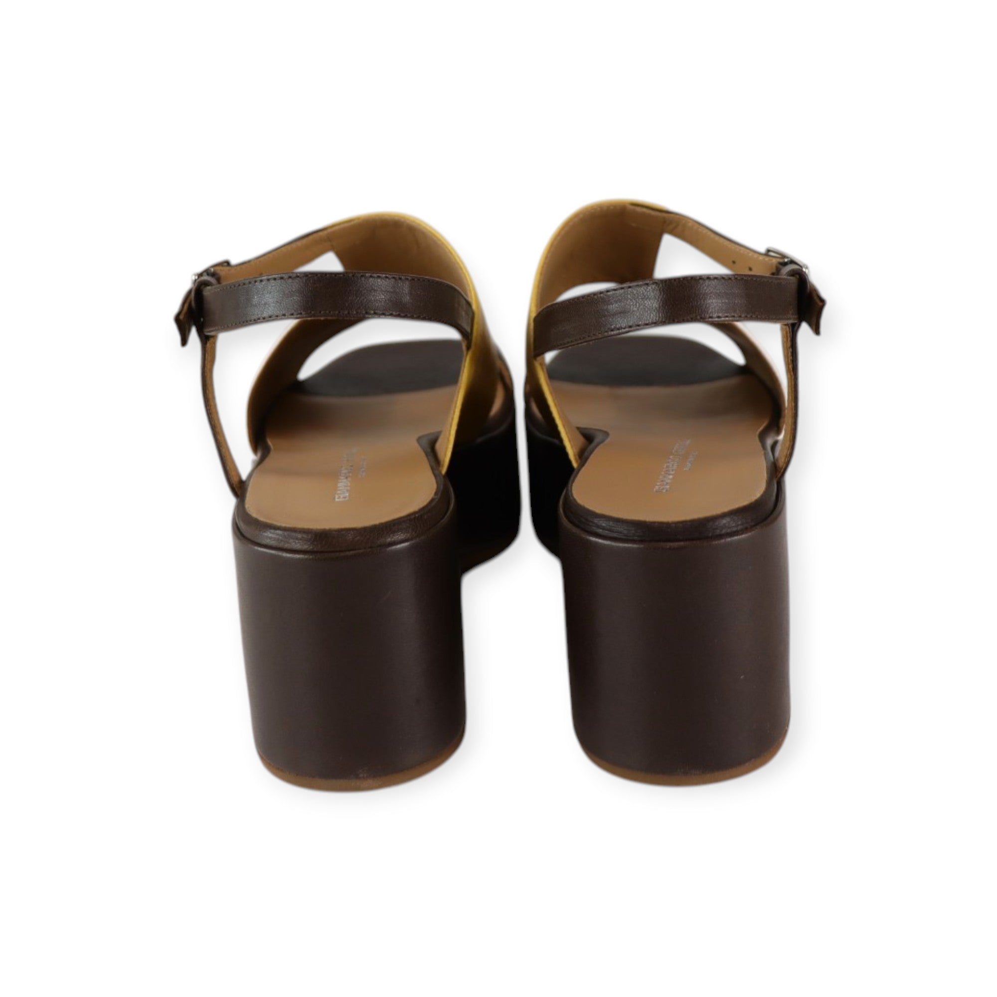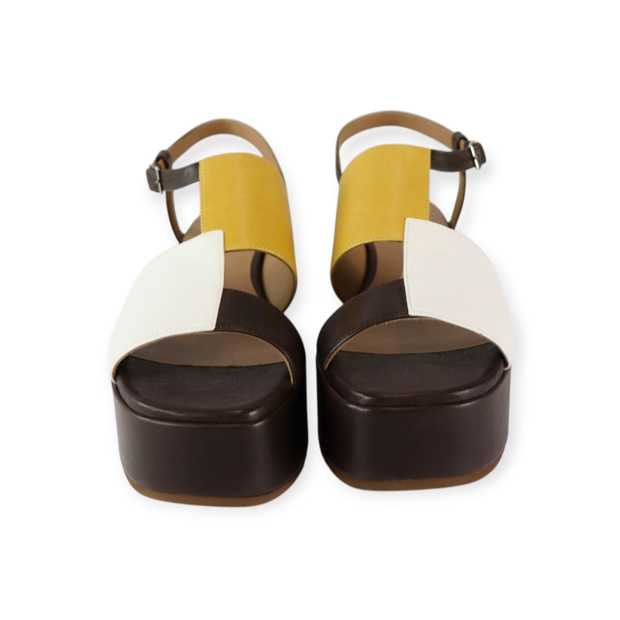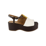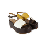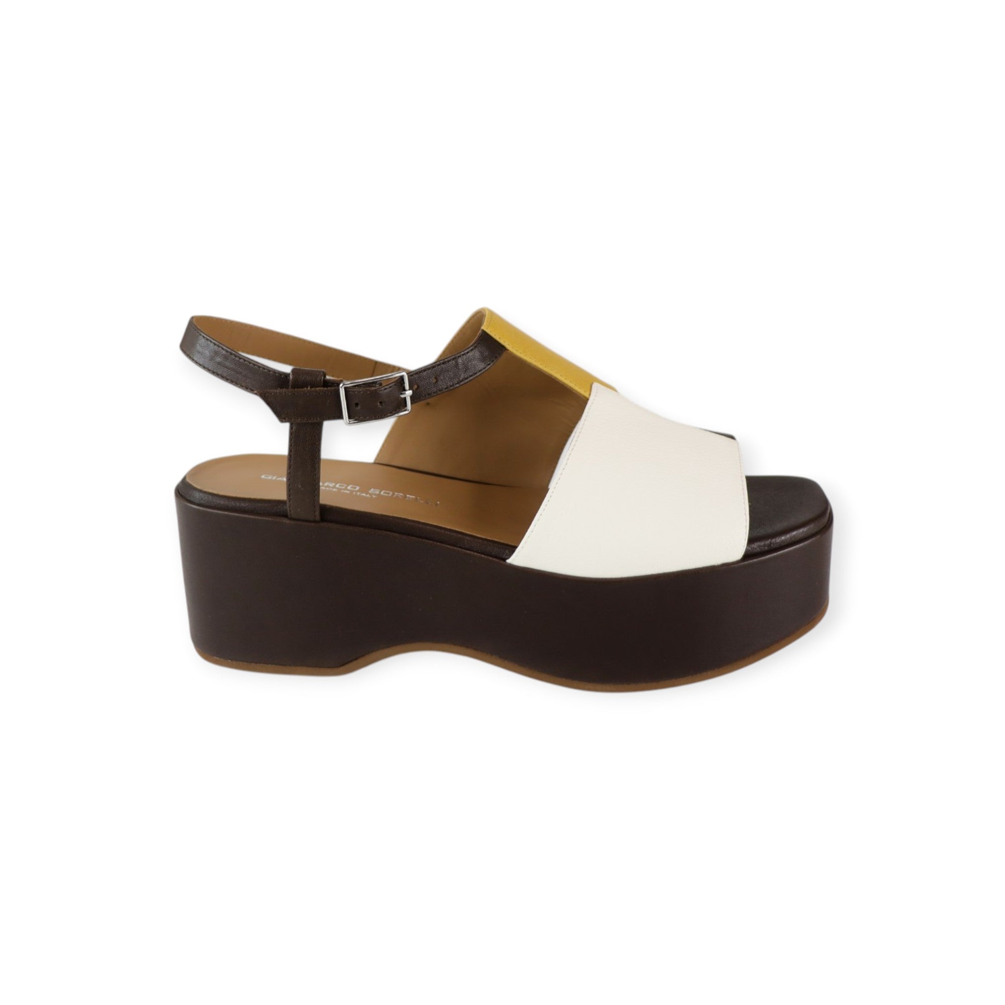 Sandalo marrone di GIANMARCO SORELLI in pelle con tomaia in pelle bianca e gialla, chiusura con cinturino alla caviglia. Zeppa alta 60mm.
