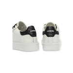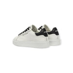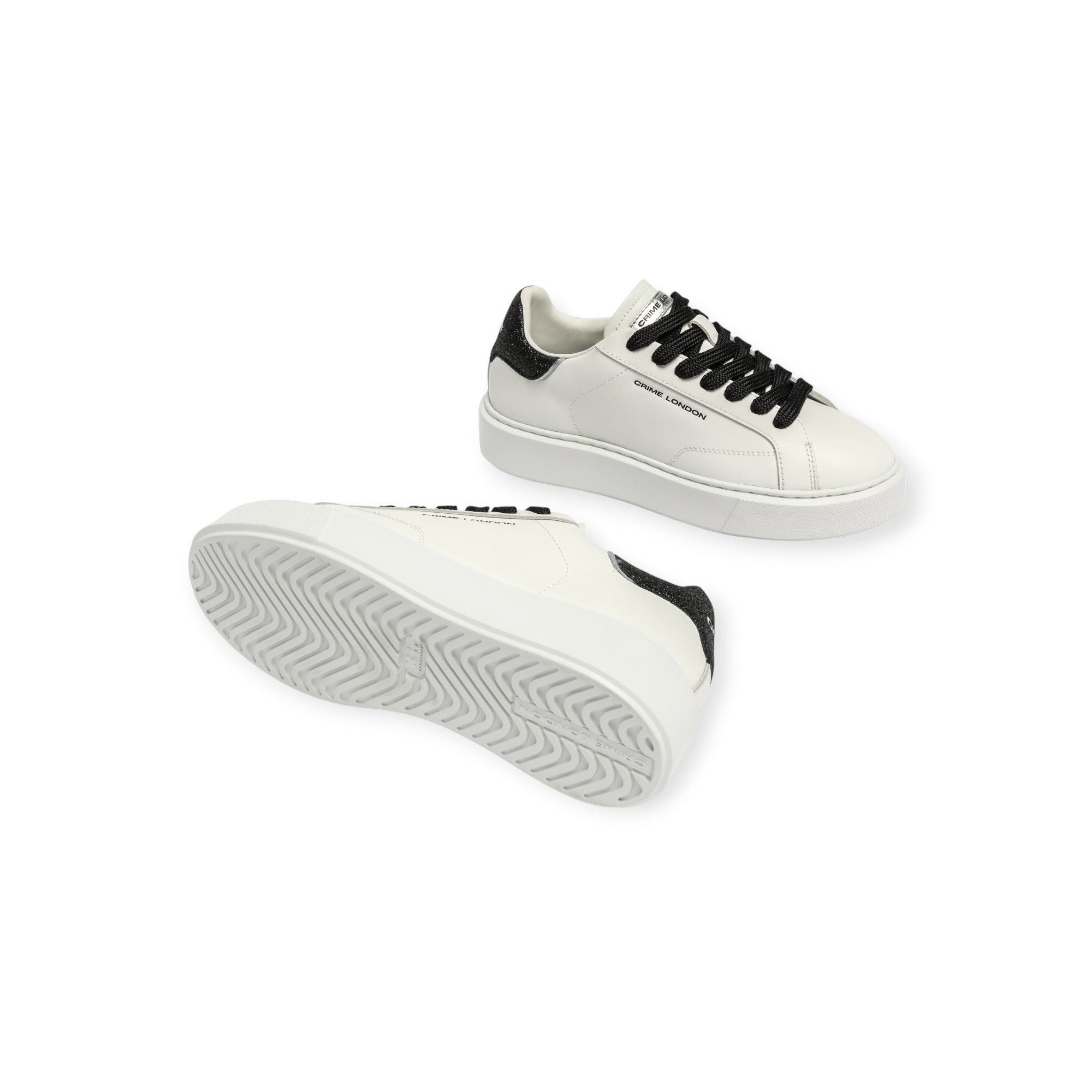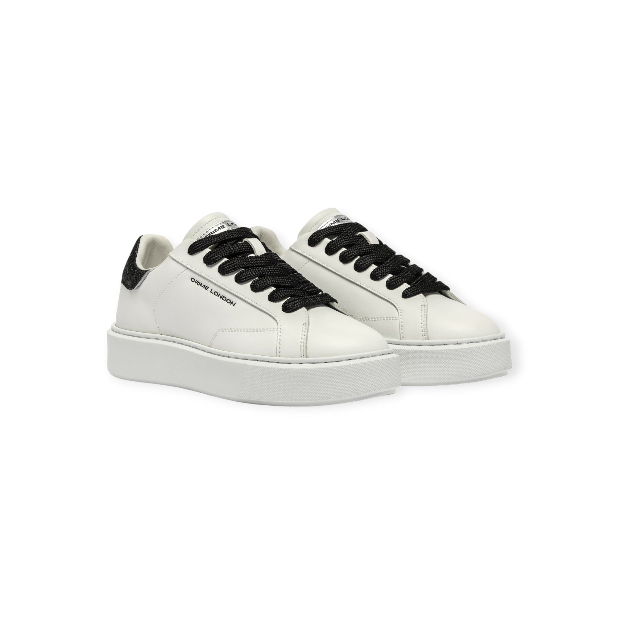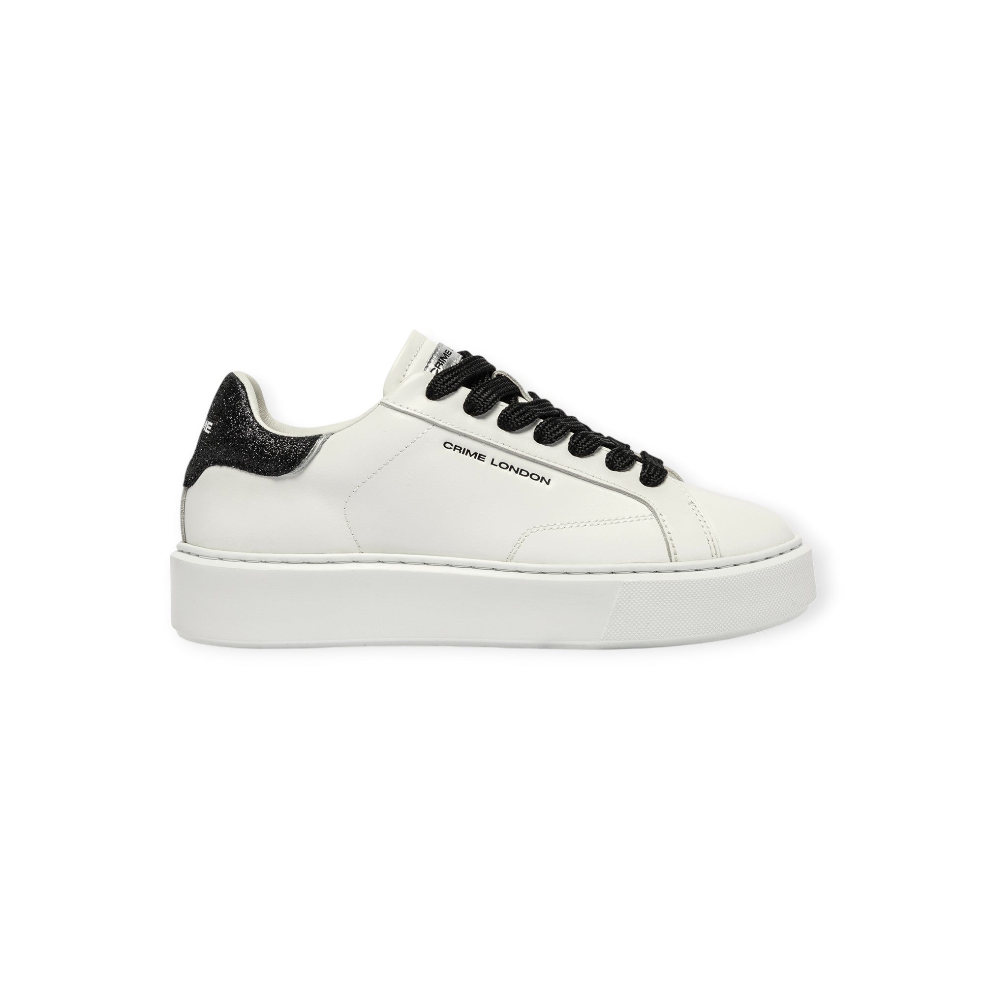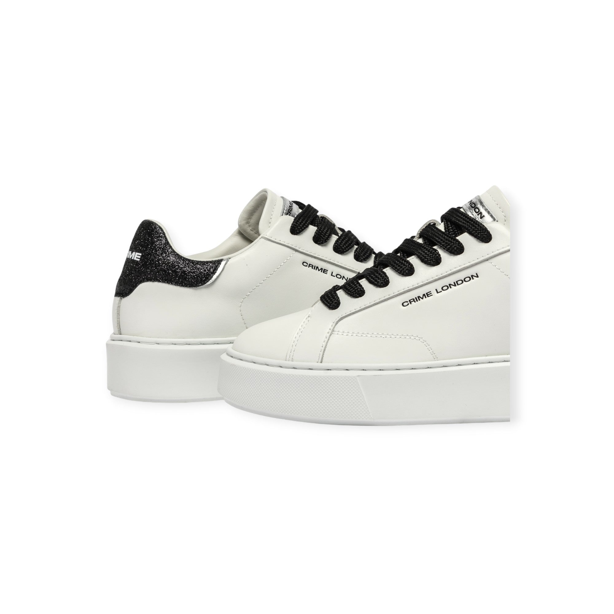 Sneakers EXTRALIGHT bianca di CRIME in pelle con talloncino posteriore in glitter nero, lacci in cotone nero, fondo extralight in gomma.