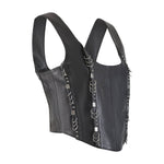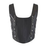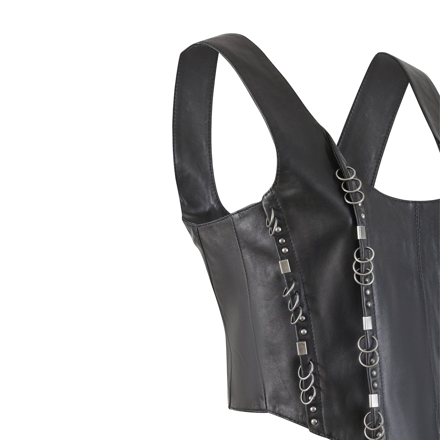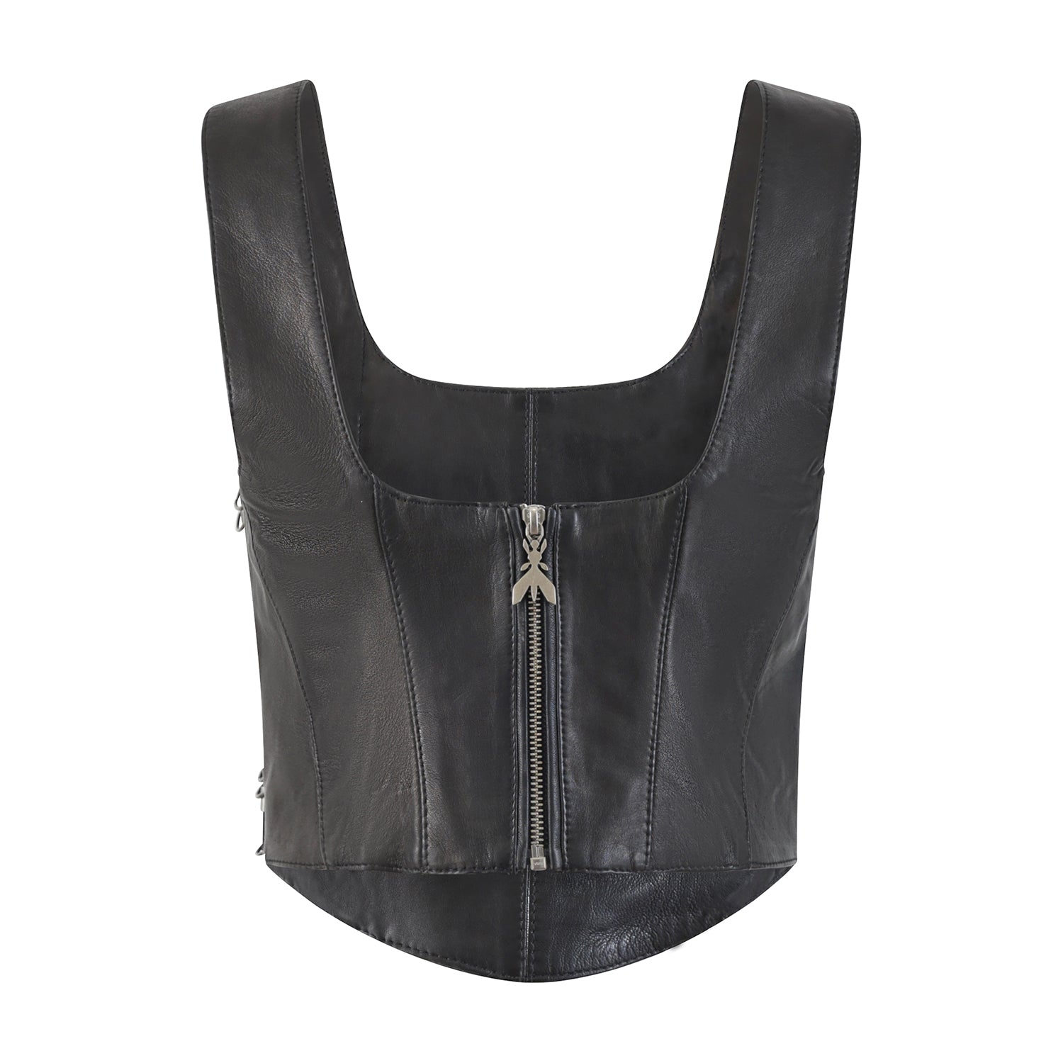 Bustier nero di PATRIZIA PEPE in nappa con vestibilità slim, dettagli in piercing con borchie in metallo, chiusura con zip posteriore.