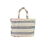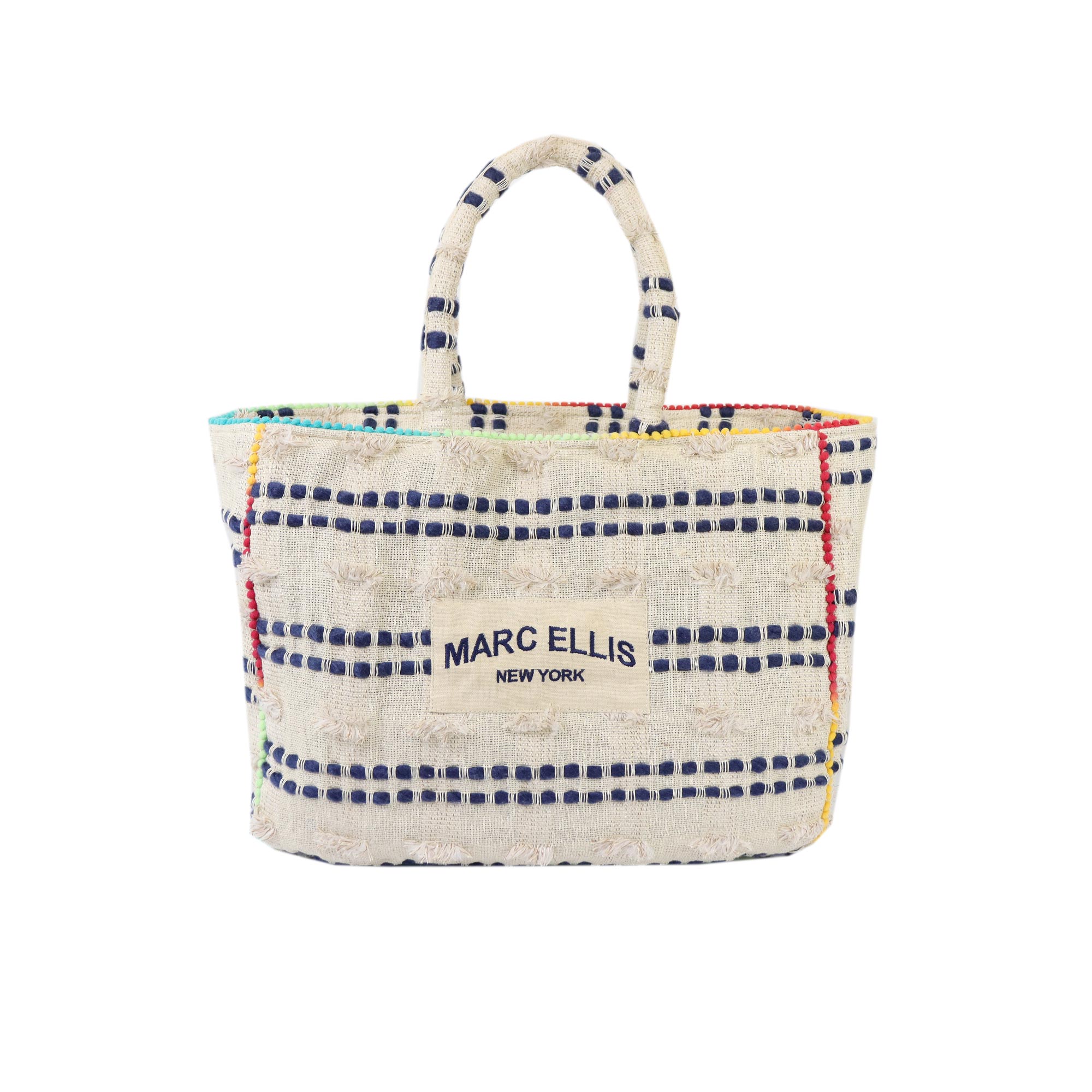 Borsa mare grande beige BUBY L INDY di MARC ELLIS in canvas con impunture blu e dettagli lungo i bordi multicolor. la borsa è dotata di una tracolla in tessuto regolabile e chiusura con cerniera. All'interno si compone di un unico scomparto avente una tasca ampia chiusa con cerniera. Misure 54x33x17