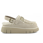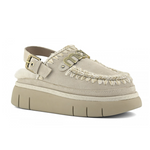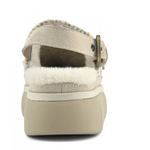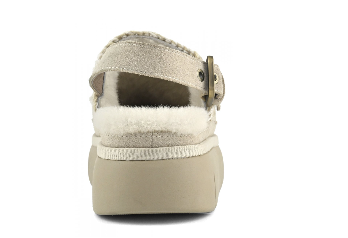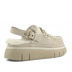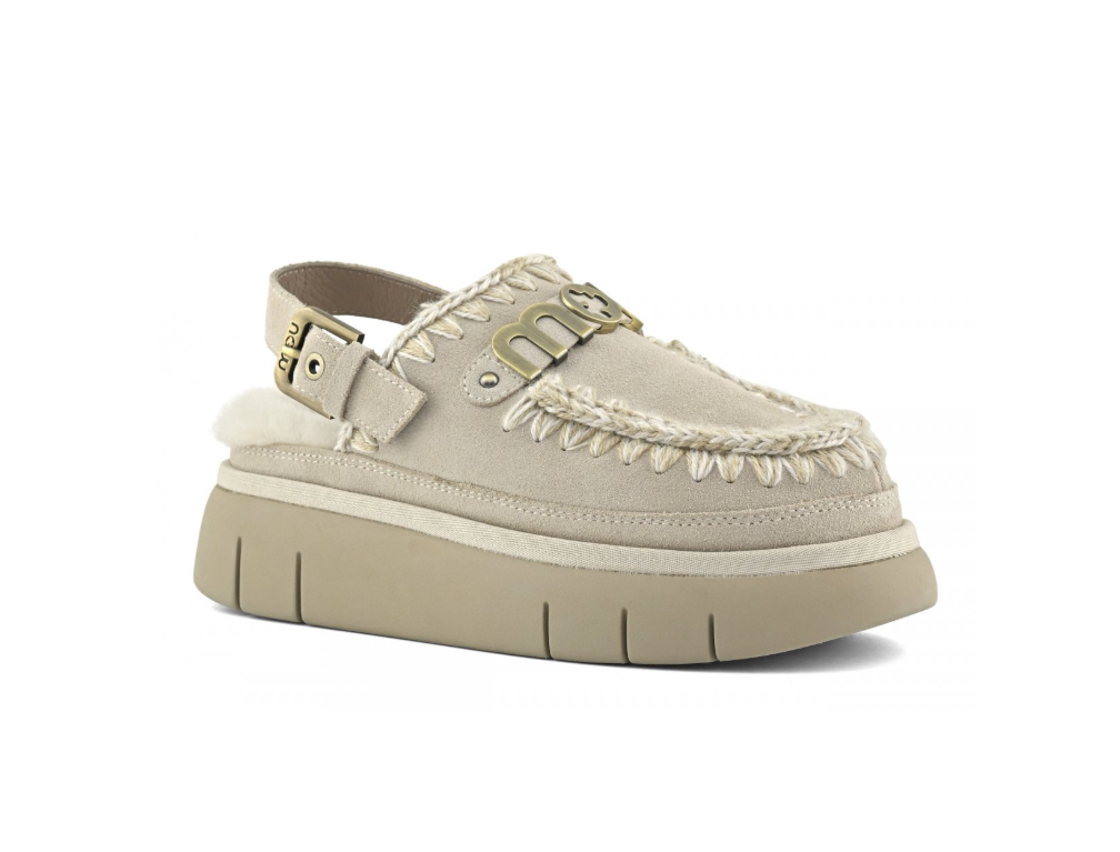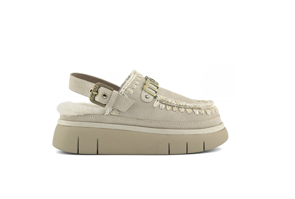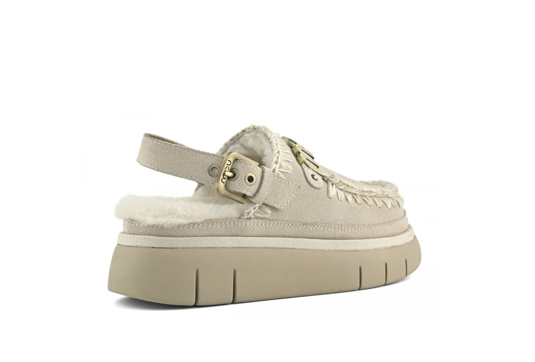 Eskimo clog slipper ghiaccio di MOU in camoscio con interno in montone, cuciture in lana in tinta, strappo posteriore con logo in metallo. Fondo in gomma.
