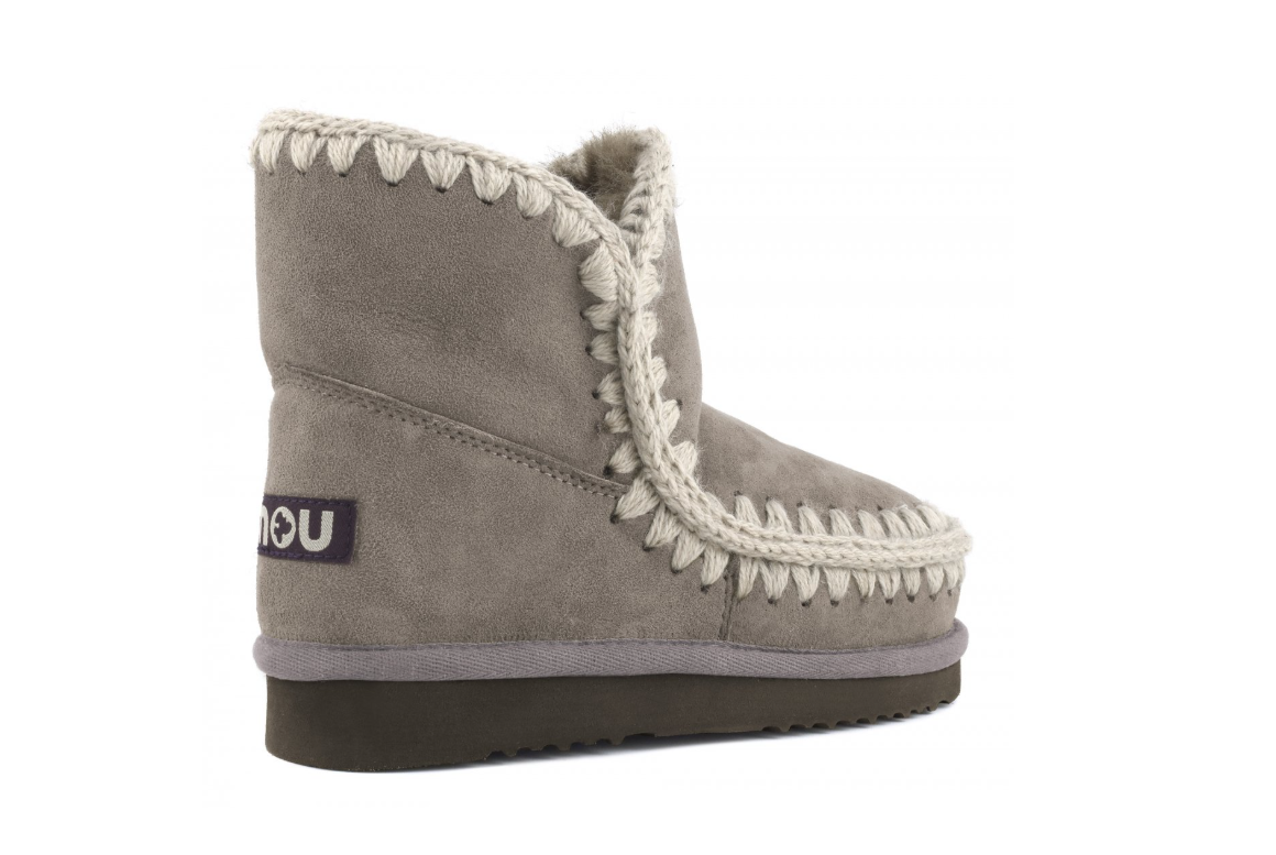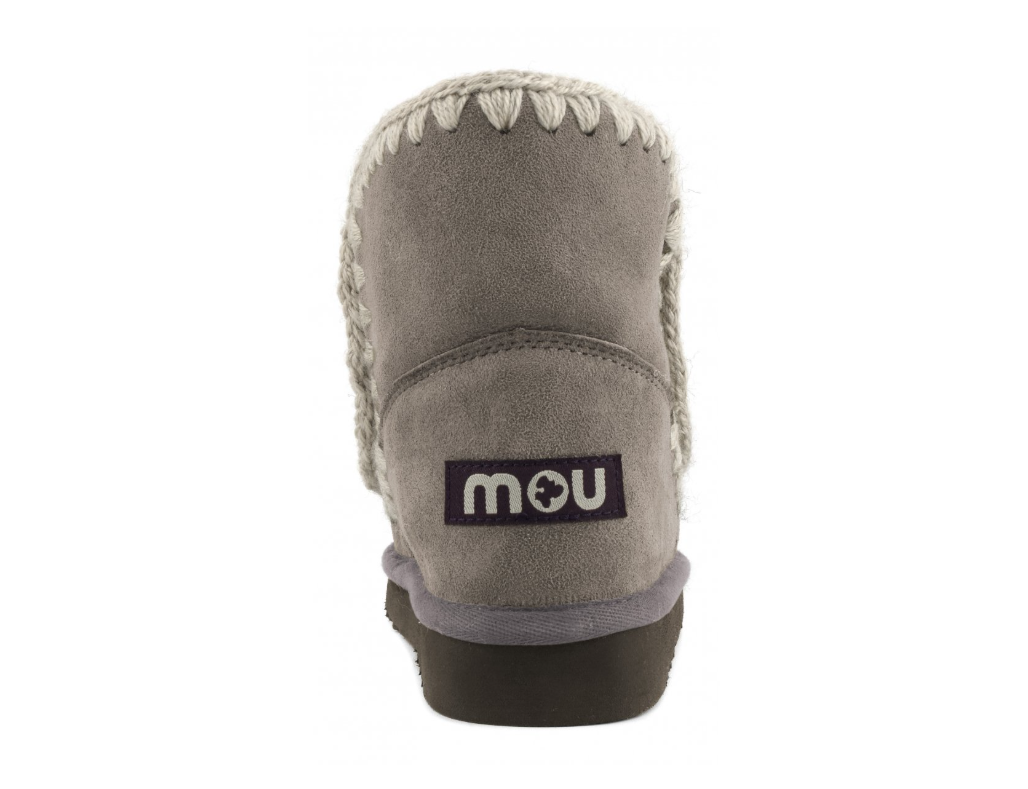 Eskimo18 elphant grey di MOU in camoscio con interno in montone, cuciture in lana in tinta, logo in tessuto. Altezza 18cm. Fondo in gomma.