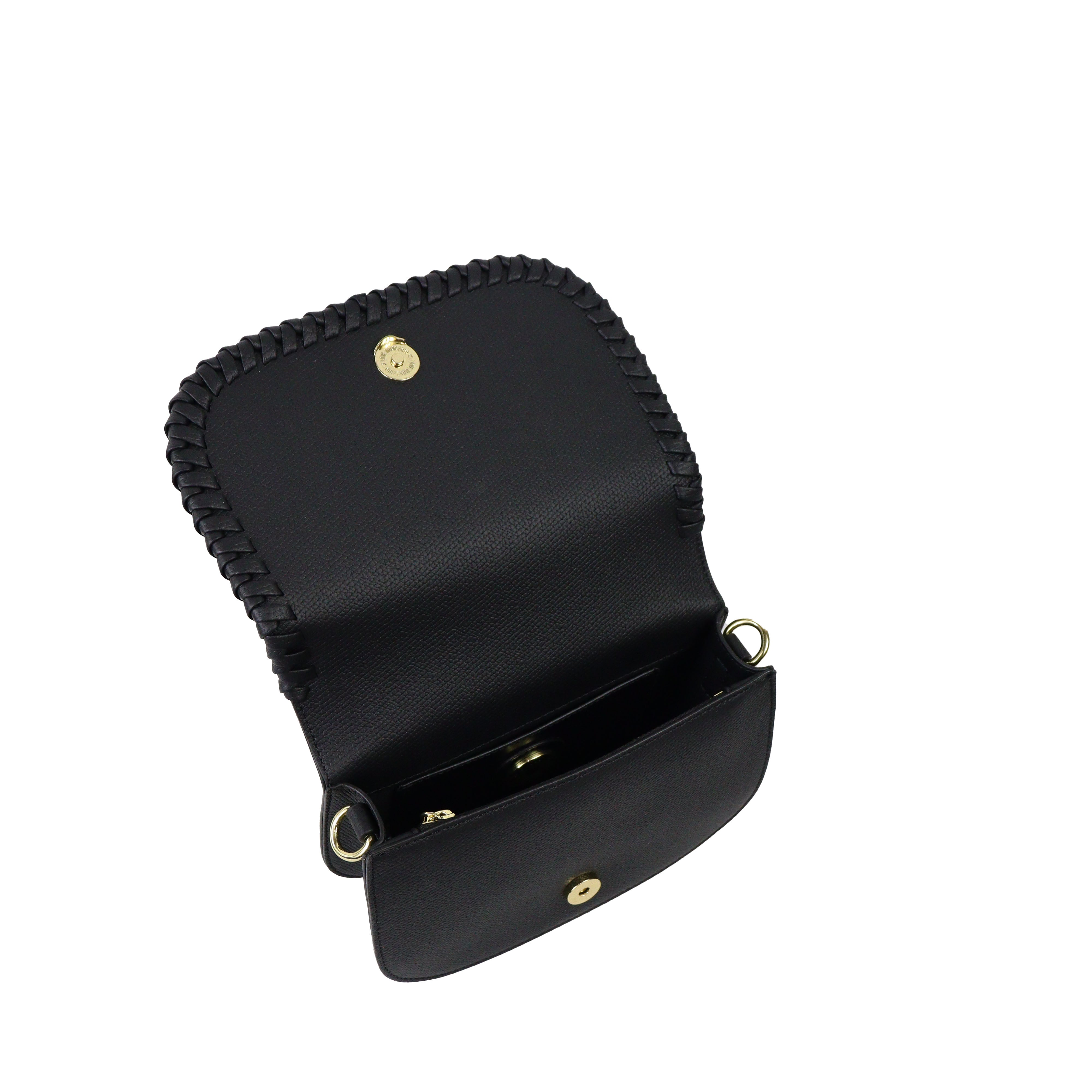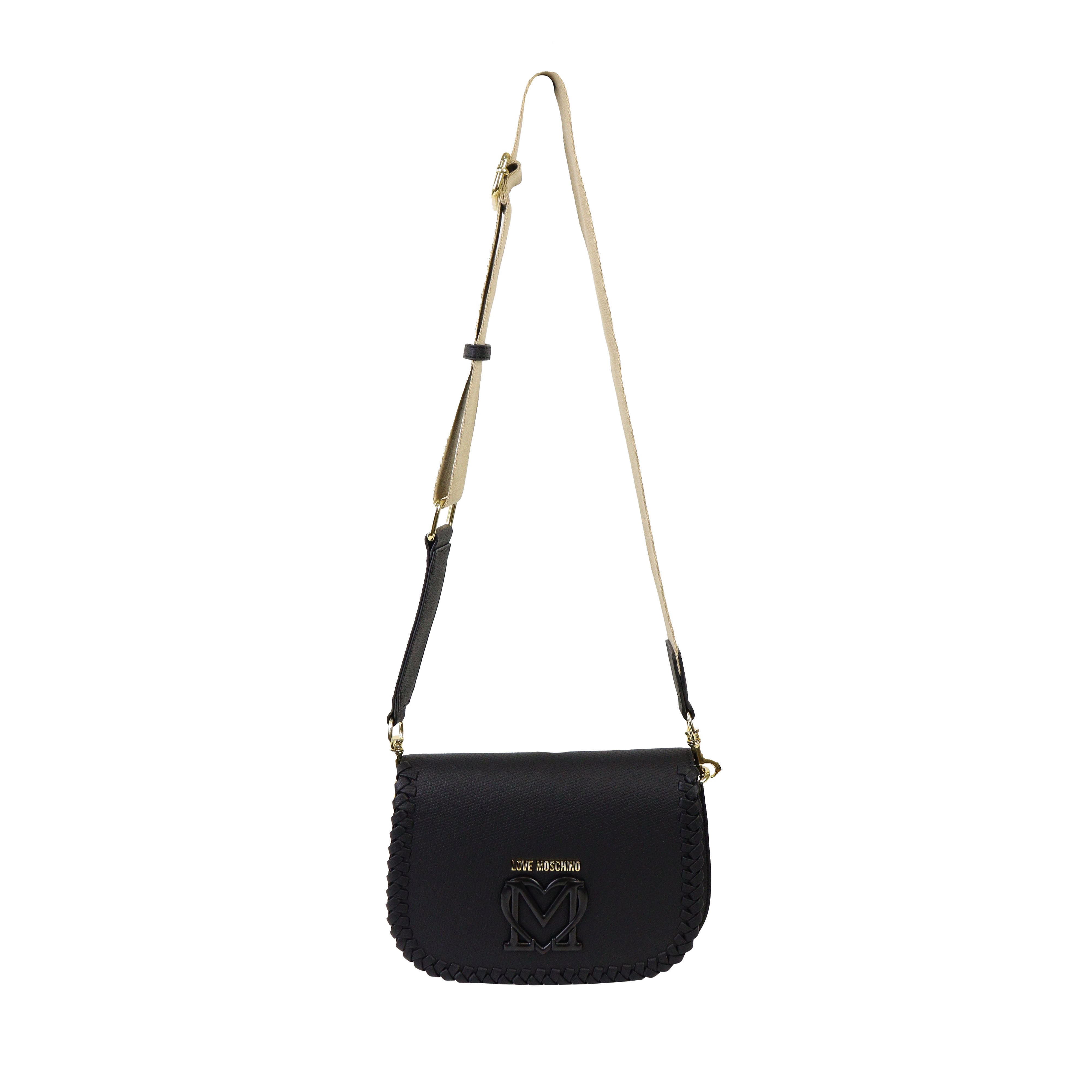 Borsa a tracolla nera di LOVE MOSCHINO in ecopelle con chiusura con patta, effetto bottolato, profili in ecopelle impunturata, tracolla in ecopelle e tessuto. Misure 21x17x8 cm.