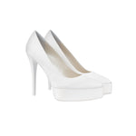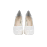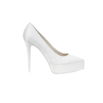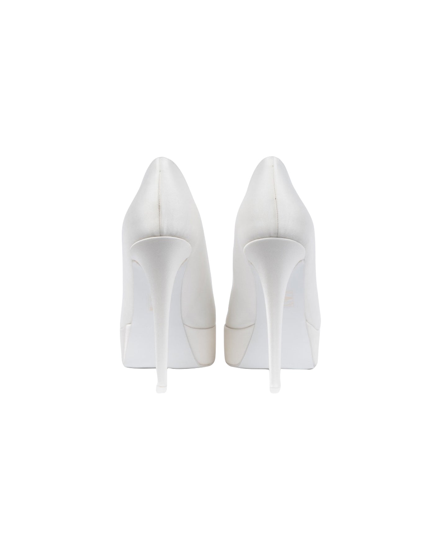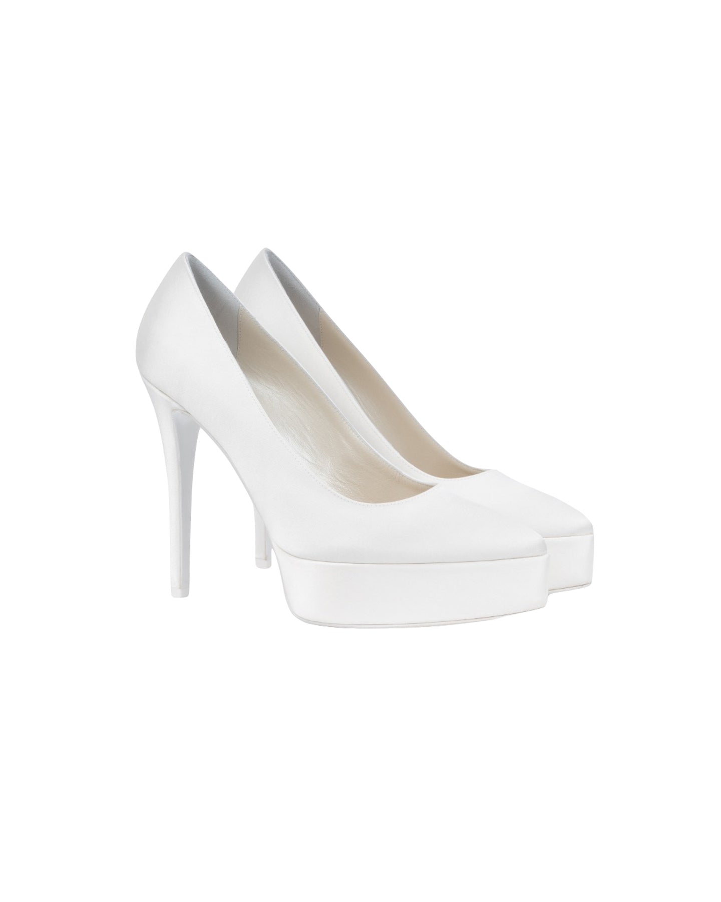 I decollete da cerimonia di Sophie Sposa. Tomaia in seta avorio. Puntale a lancia. Tacco 11 cm e plateau 2 cm. Colore: avorio.