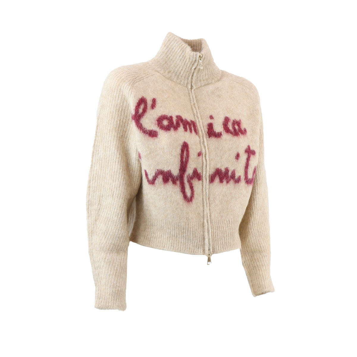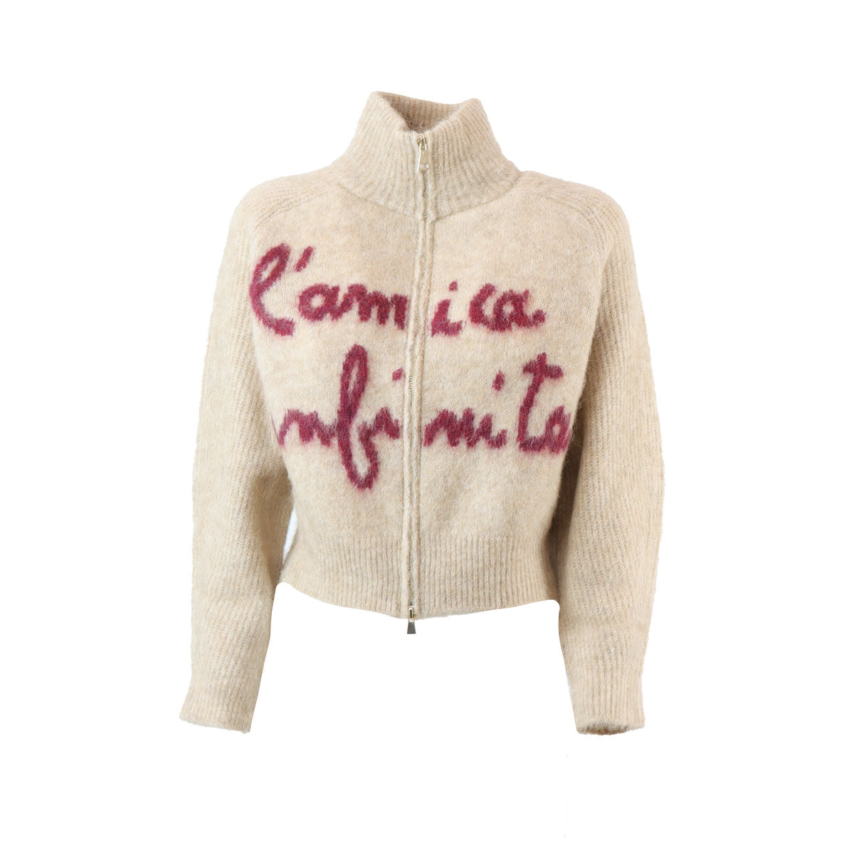 Maglia con zip INFINTA beige di IBLUES in misto alpaca con linea morbida, collo alto, maniche lunghe e chiusura con zip a doppio cursore. Lettering in bordeaux. Fit regolare.