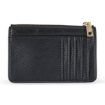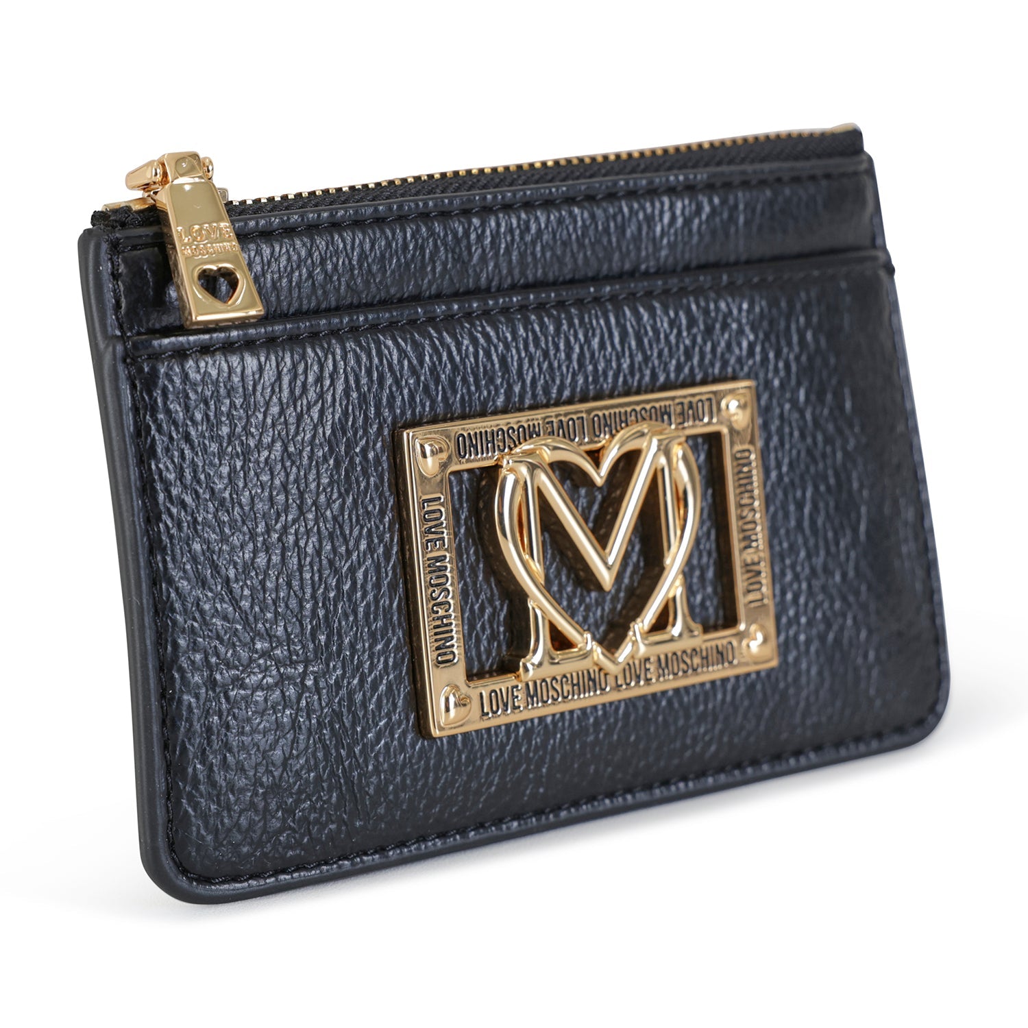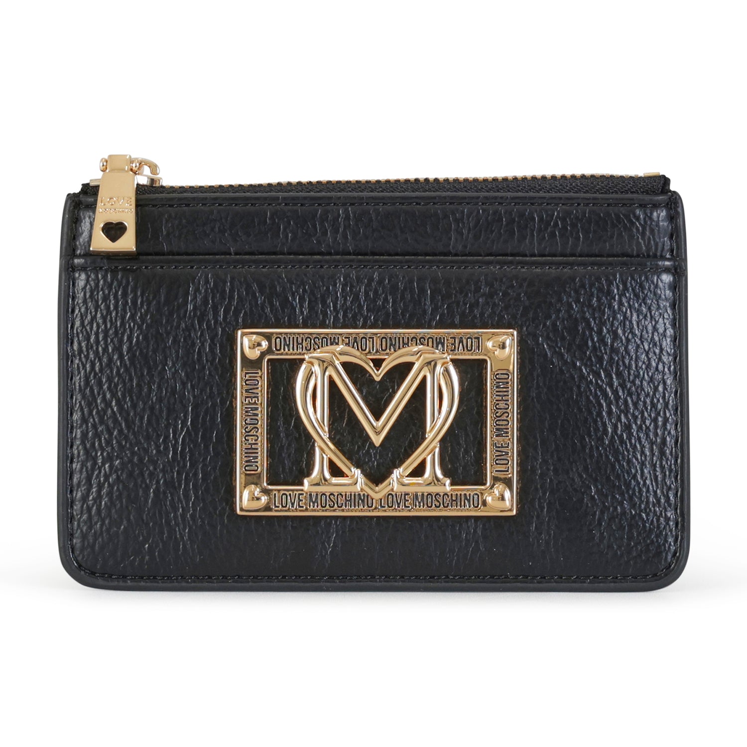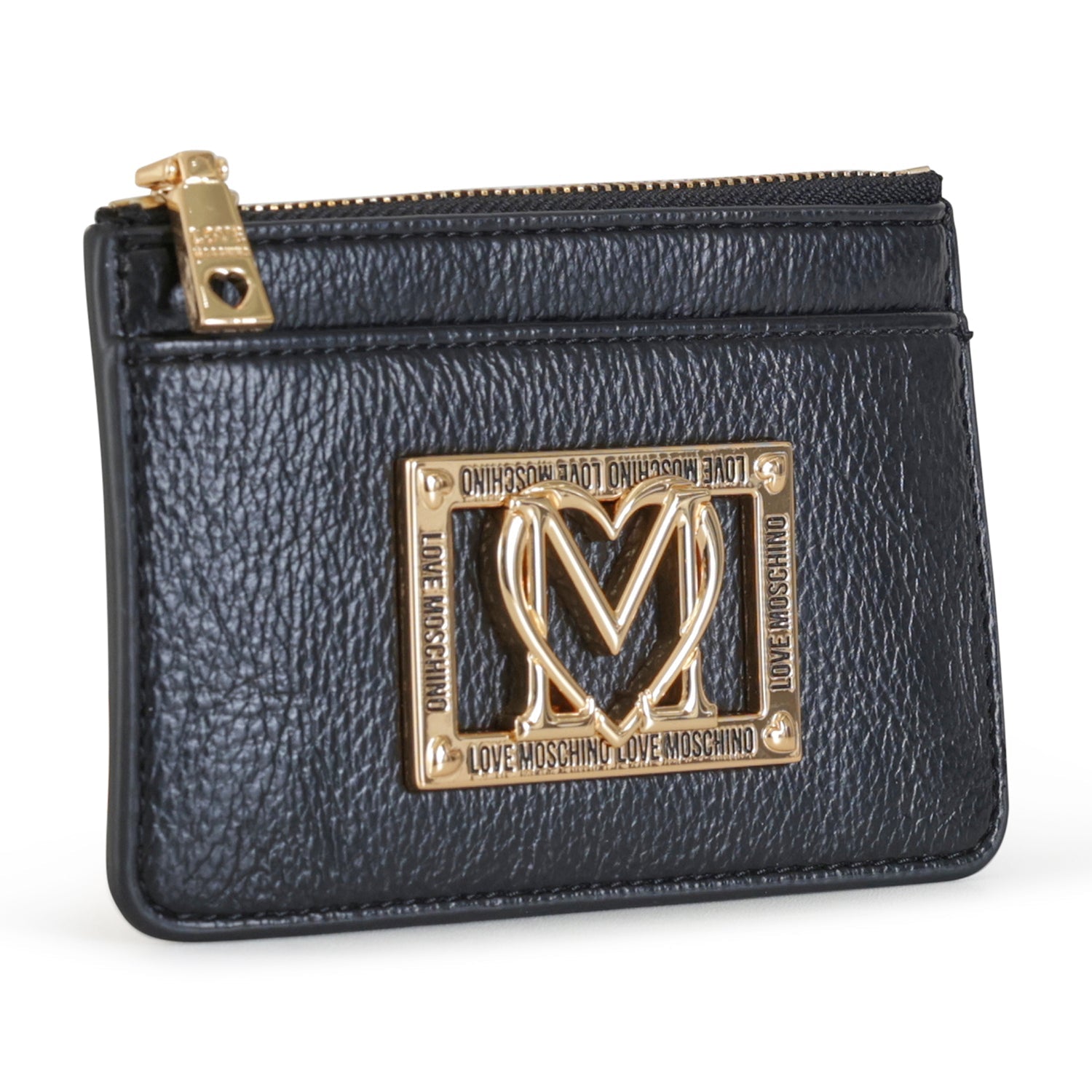Portacarte nero di LOVE MOSCHINO in ecopelle con chiusura con zip per monete, logo in metallo oro. Misure 14x9x1 cm.