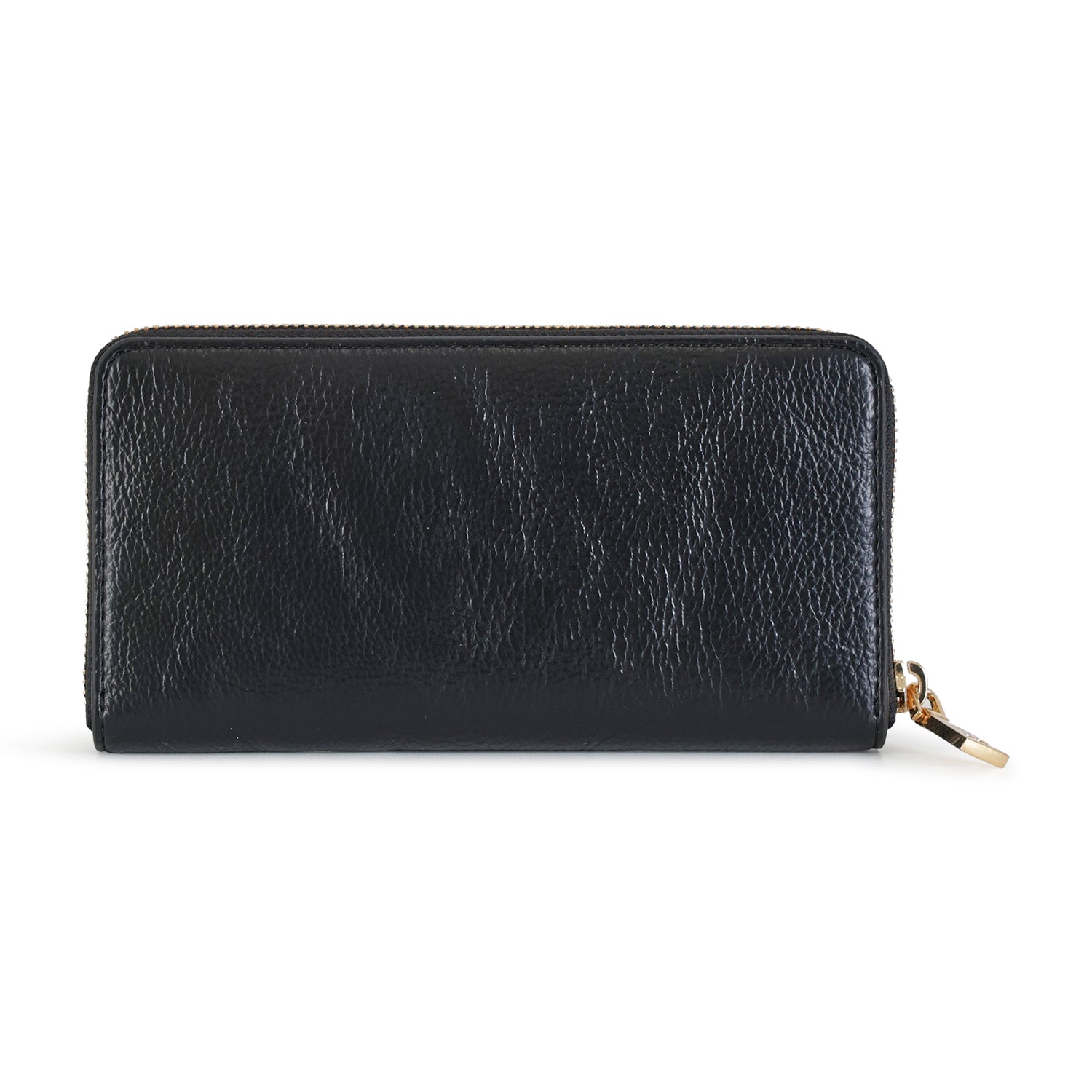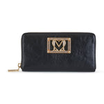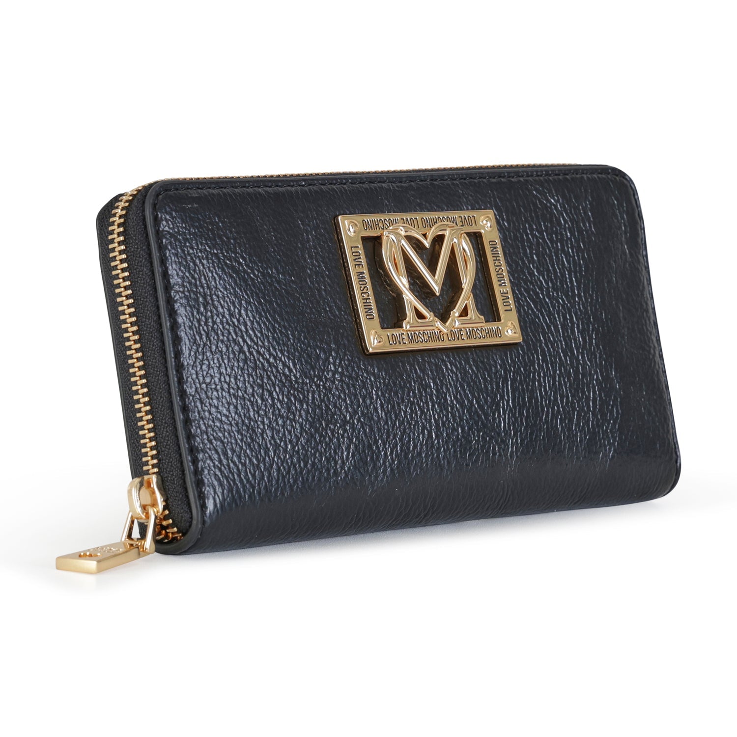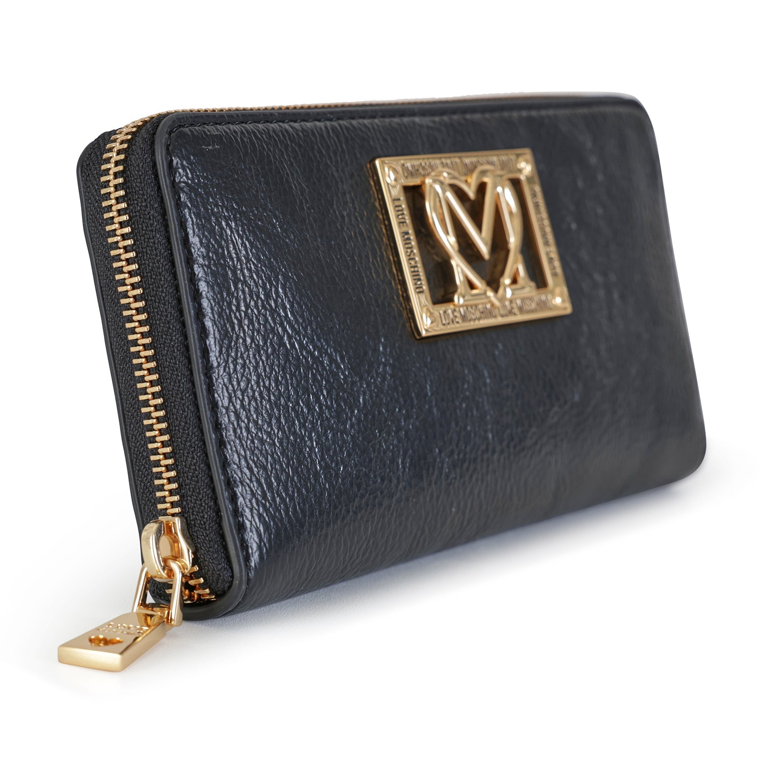 Portafogli nero di LOVE MOSCHINO in ecopelle con effetto martellato, logo in metallo oro e zip around. Misure 19x10x3 cm.