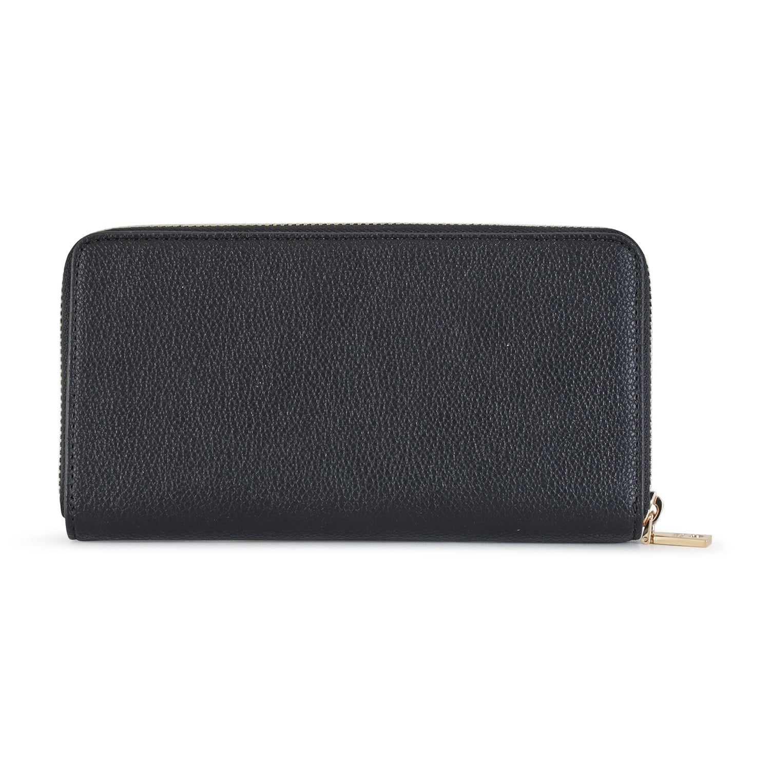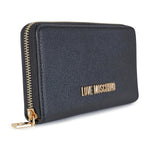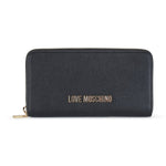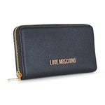 Portafogli nero di LOVE MOSCHINO in ecopelle con effetto martellato, logo lettering in metallo oro e zip around. Misure 19x10x3 cm.