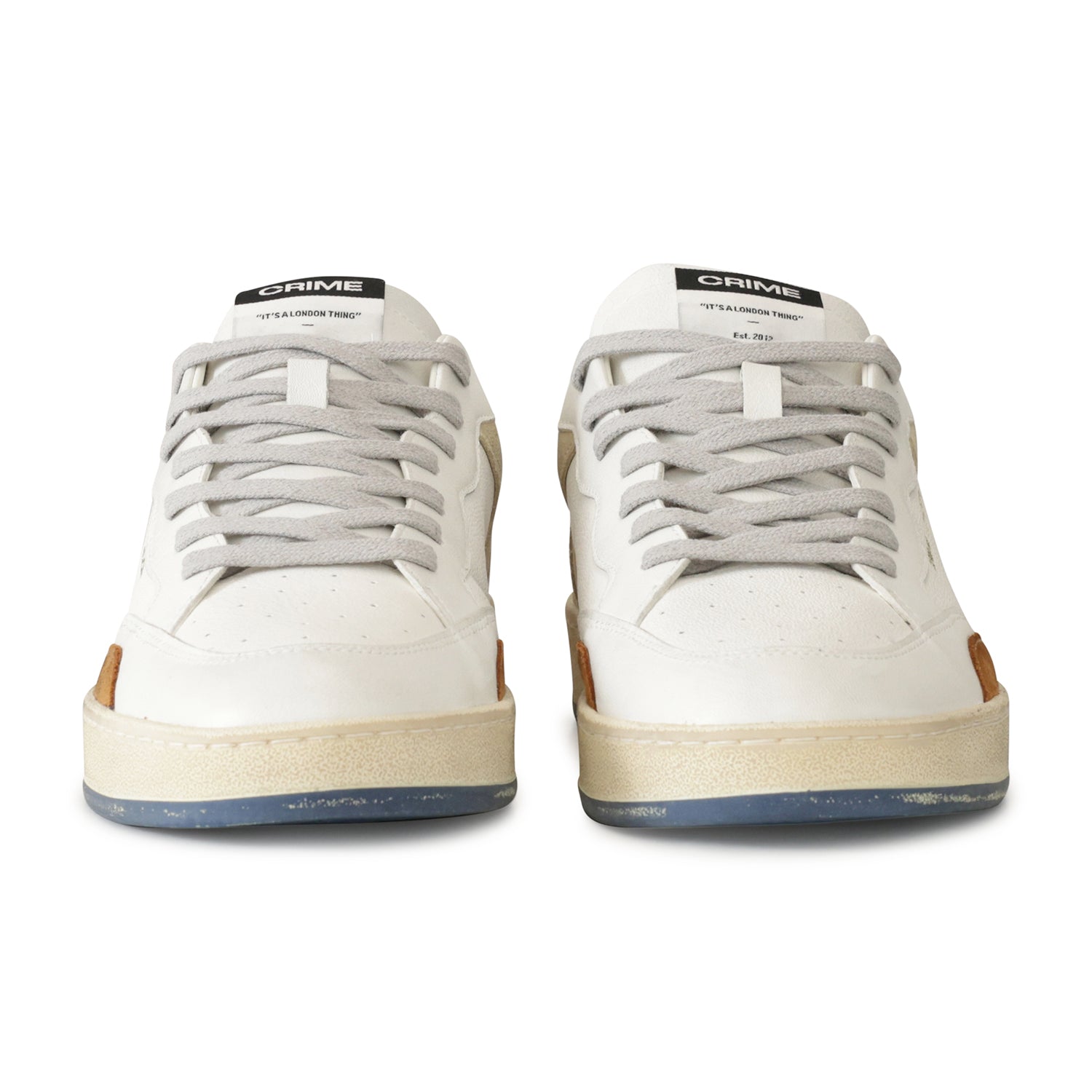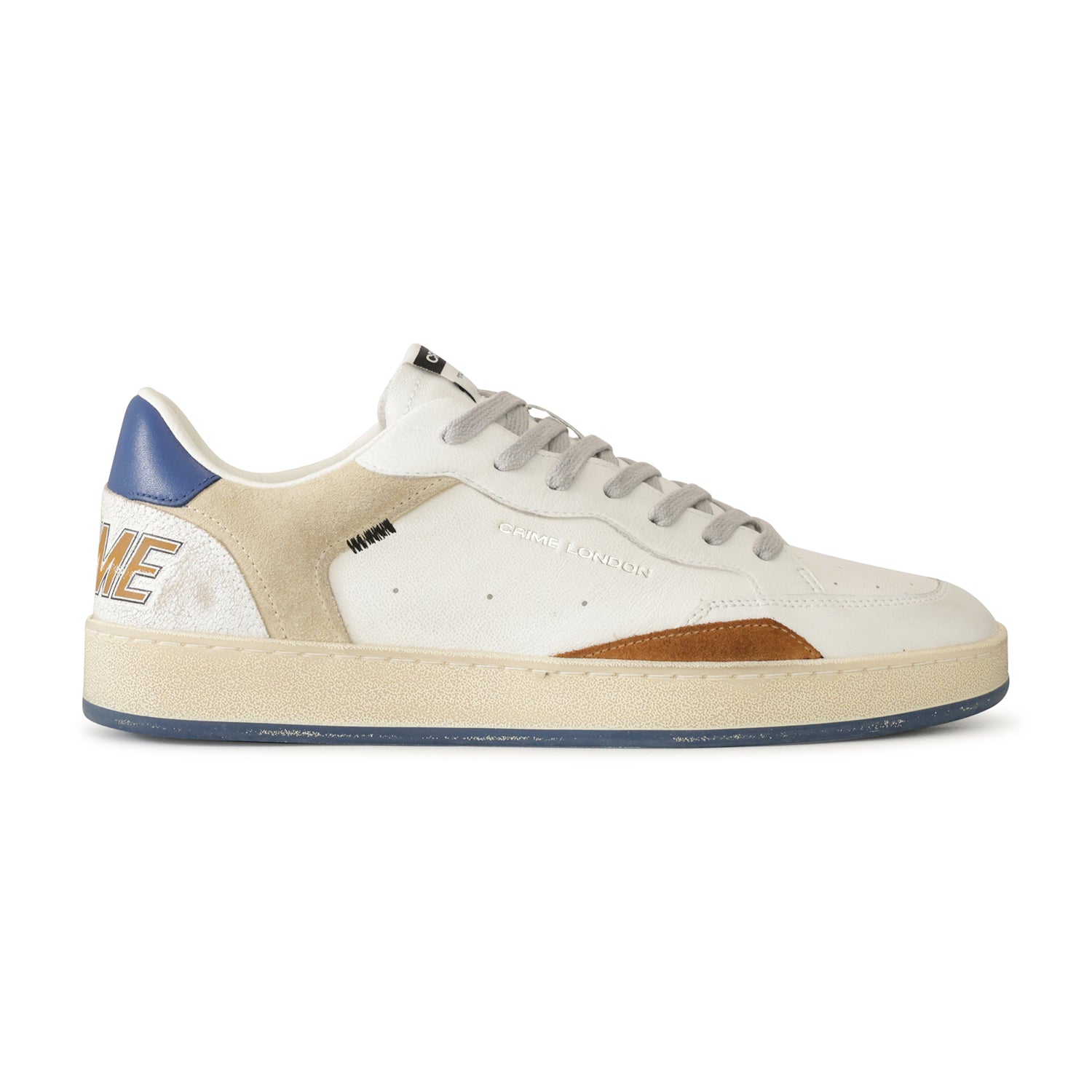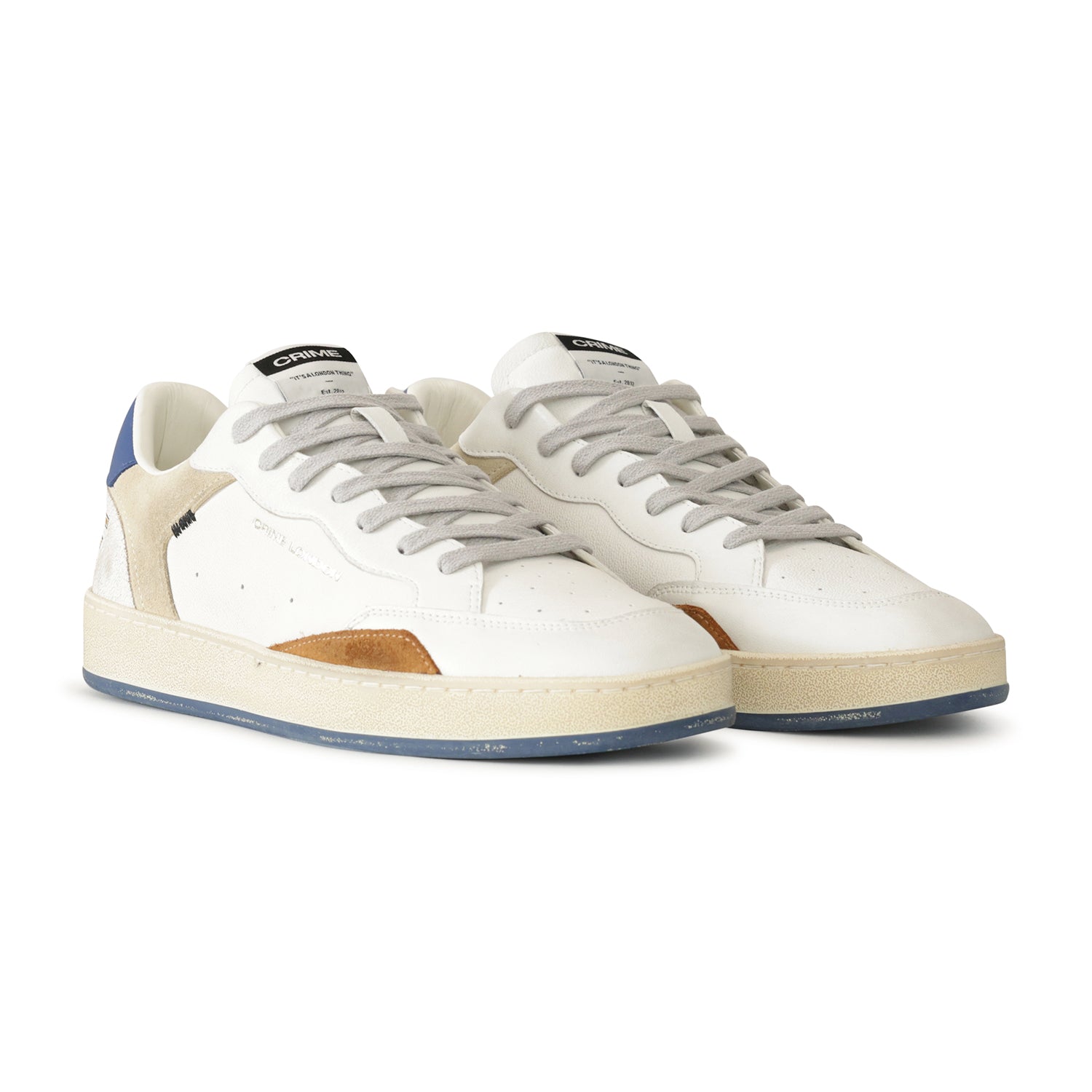 Sneakers CHELSEA bianca di CRIME in pelle con profili in camoscio cuoio e beige, tallone in pelle blu, logo lettering posteriore. Fondo in gomma.